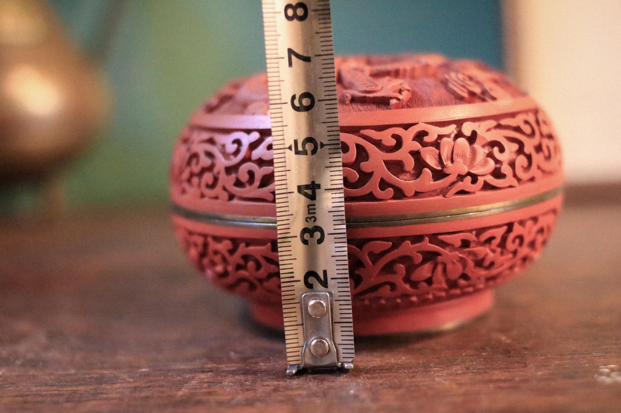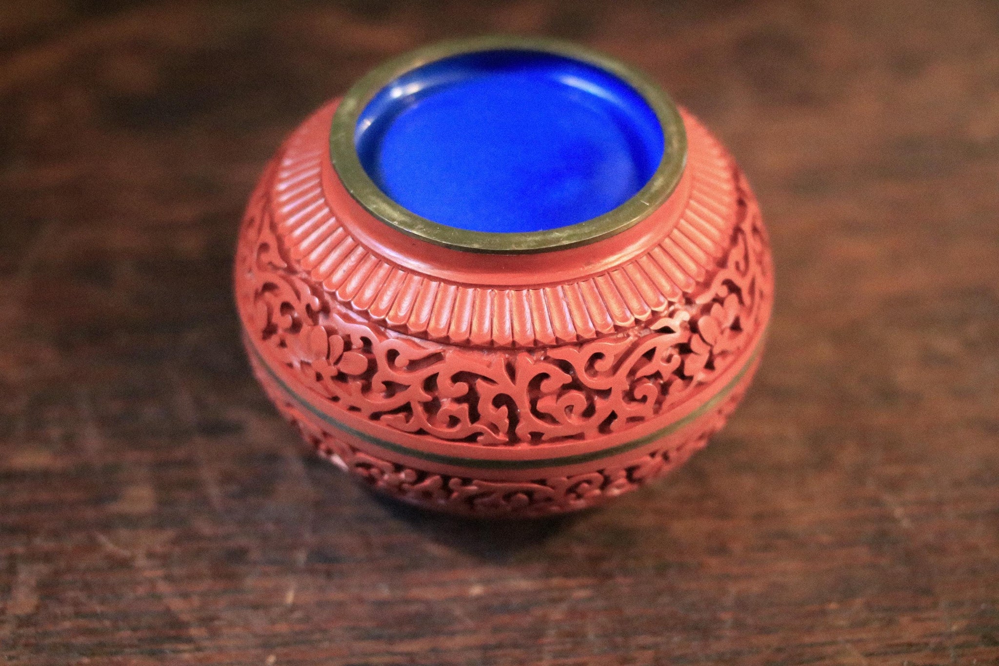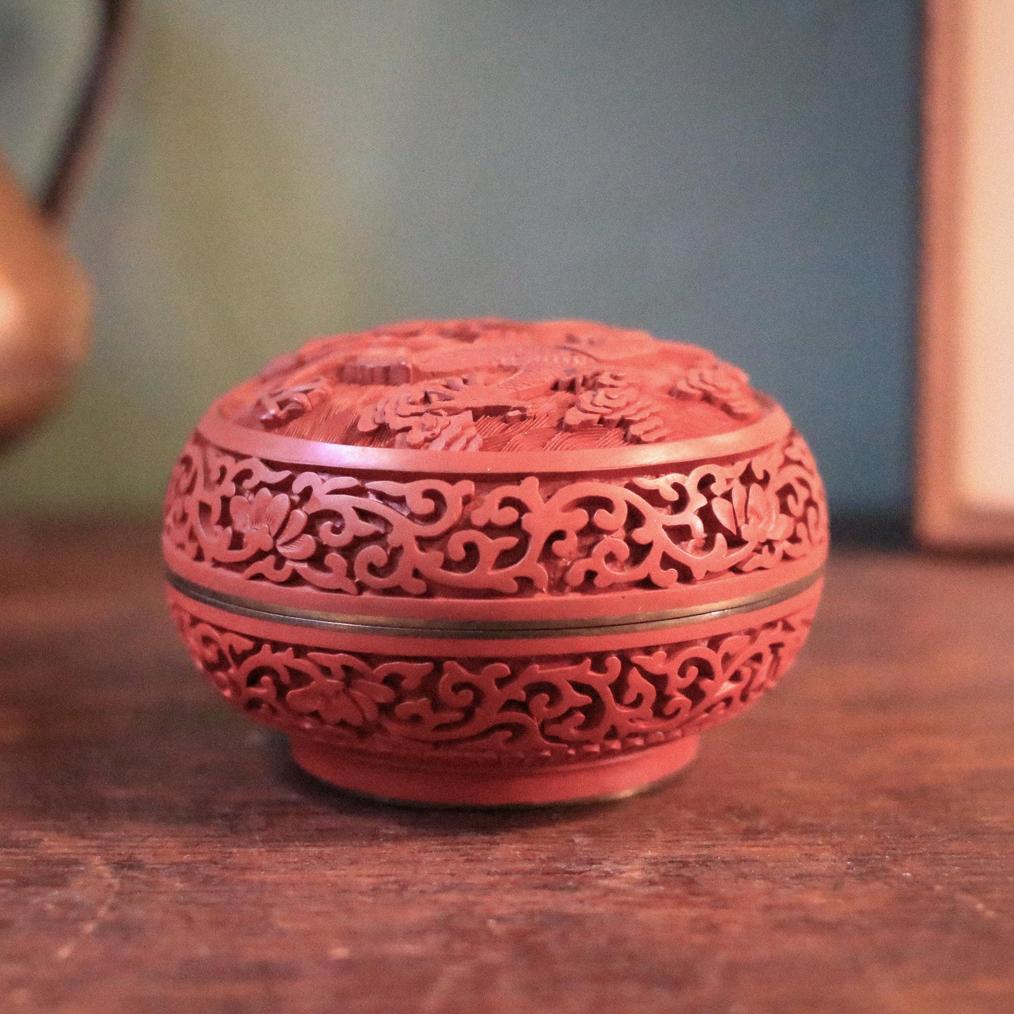 A richly detailed carved lacquerware trinket box with pierced scrollwork sides and a raised relief lid featuring birds among blossoms, finished in that classic cinnabar-red tone with a glossy cobalt-blue interior and a warm metal band at the join. It’s a perfect little accent for the current Chinoiserie / Grandmillennial revival—looks brilliant layered into a maximalist shelf, on a vanity, or on a coffee table stack, and it’s genuinely useful for rings, small jewellery, matches, or tiny keepsakes.