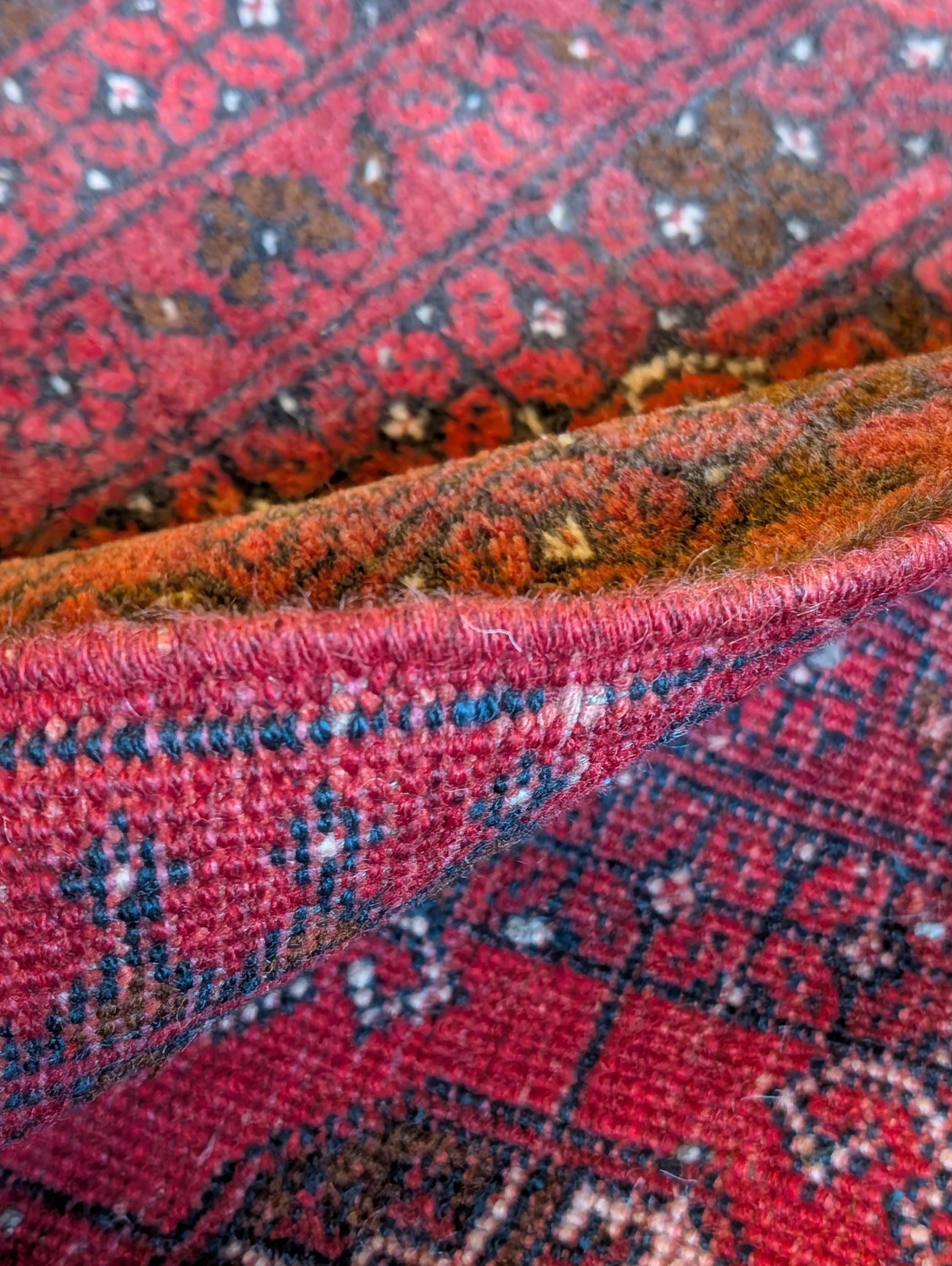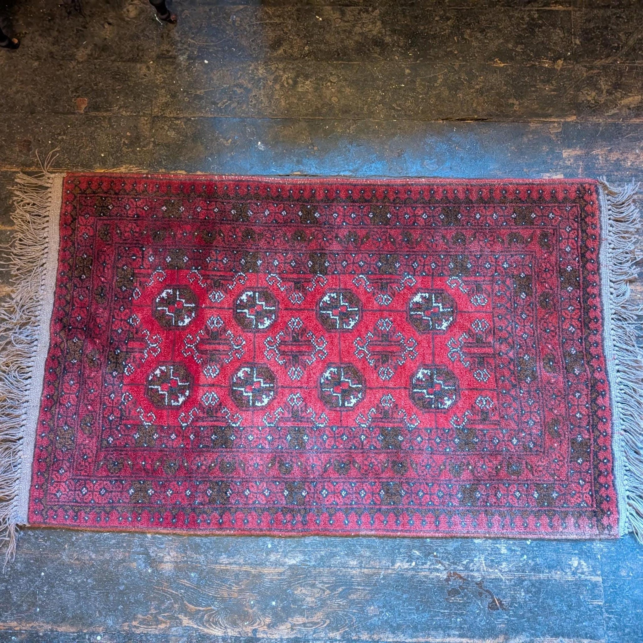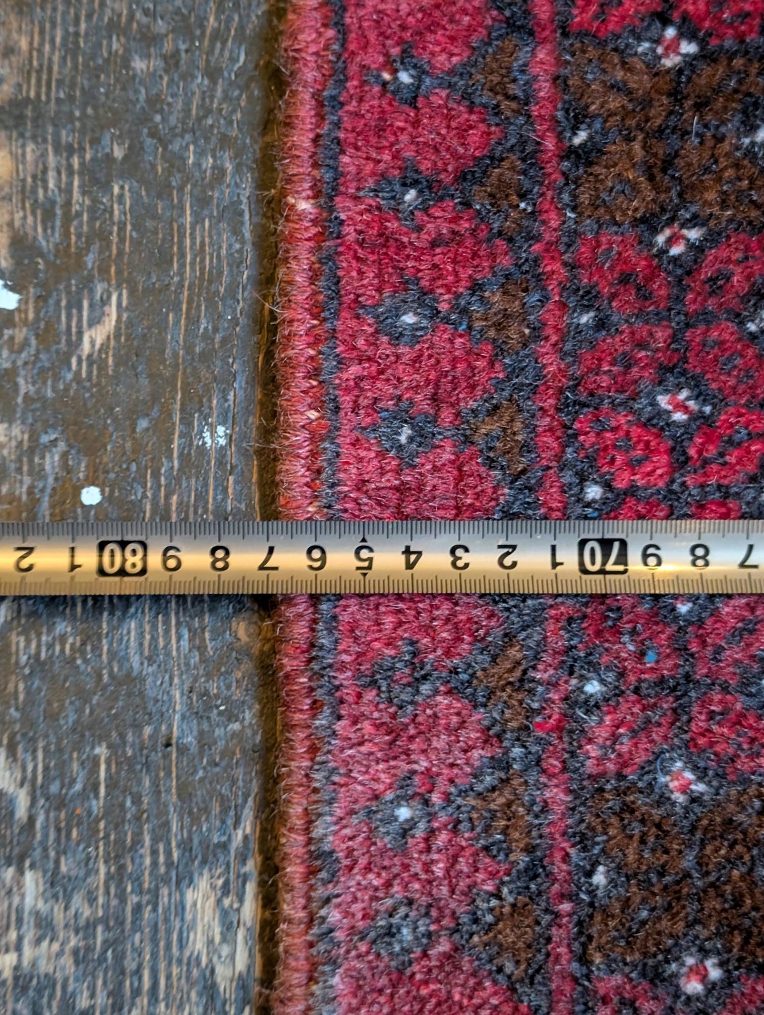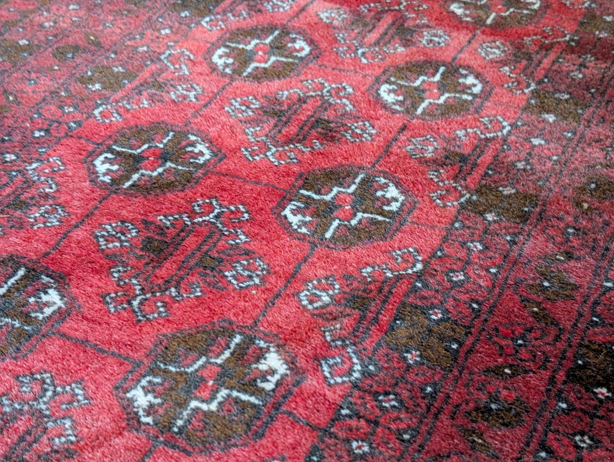A richly coloured vintage tribal wool rug in classic madder red with repeating gul motifs and a dense border in charcoal and deep wine tones—an instantly grounding piece for an Old Money / Dark Academia look (especially great layered over boards or stone, or used to add warmth to a hallway or bedside spot). This reads as an Afghan Turkoman (Bokhara-style) weave, likely Northern Afghanistan / Pakistan region, mid 20th century.