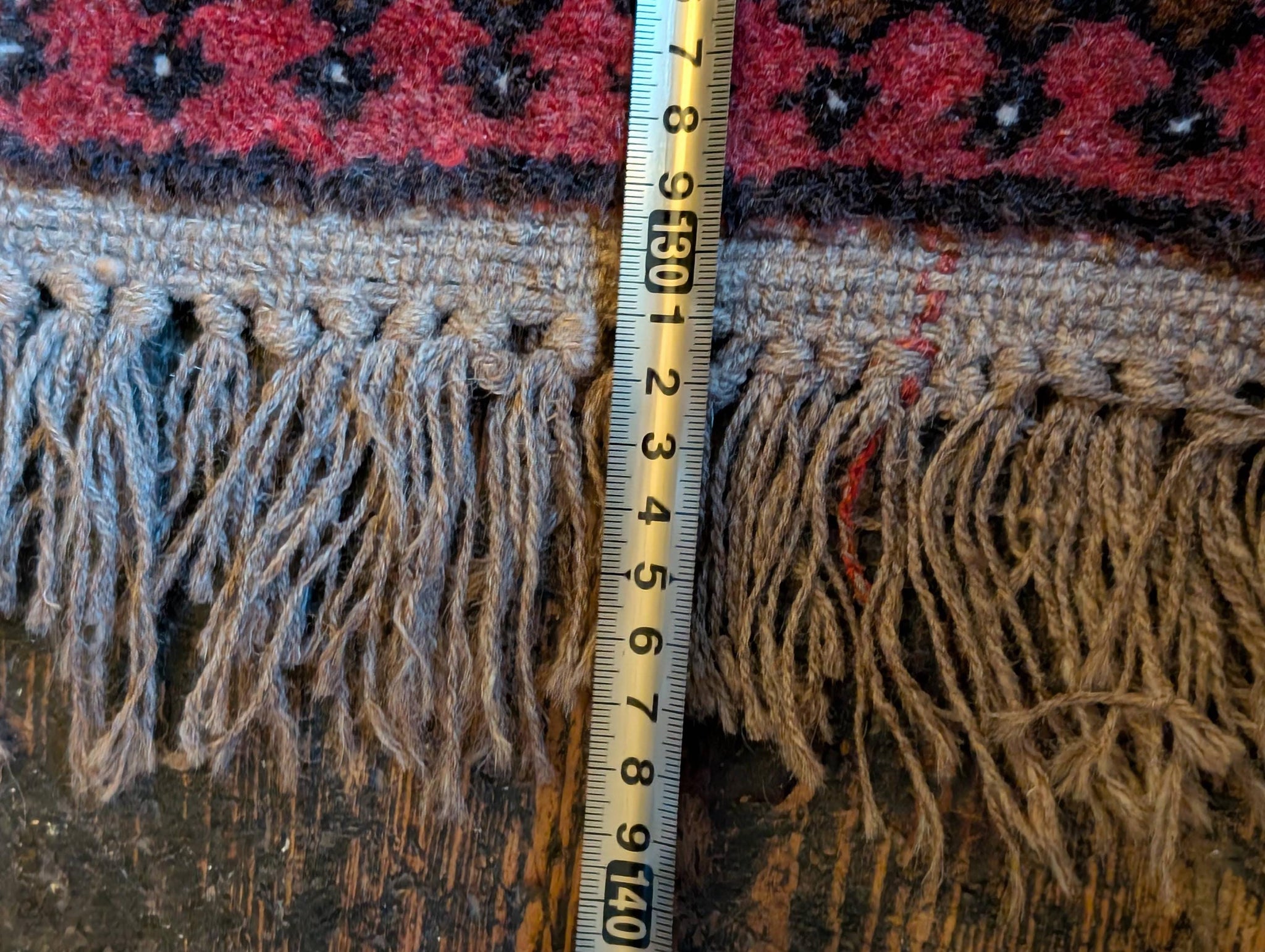 Condition is good vintage with age-appropriate wear, including some fringe wear and minor edge/corner wear consistent with use (see close-ups), plus slight variation in pile and colour that adds to the character. Size: 77 x 138 cm.