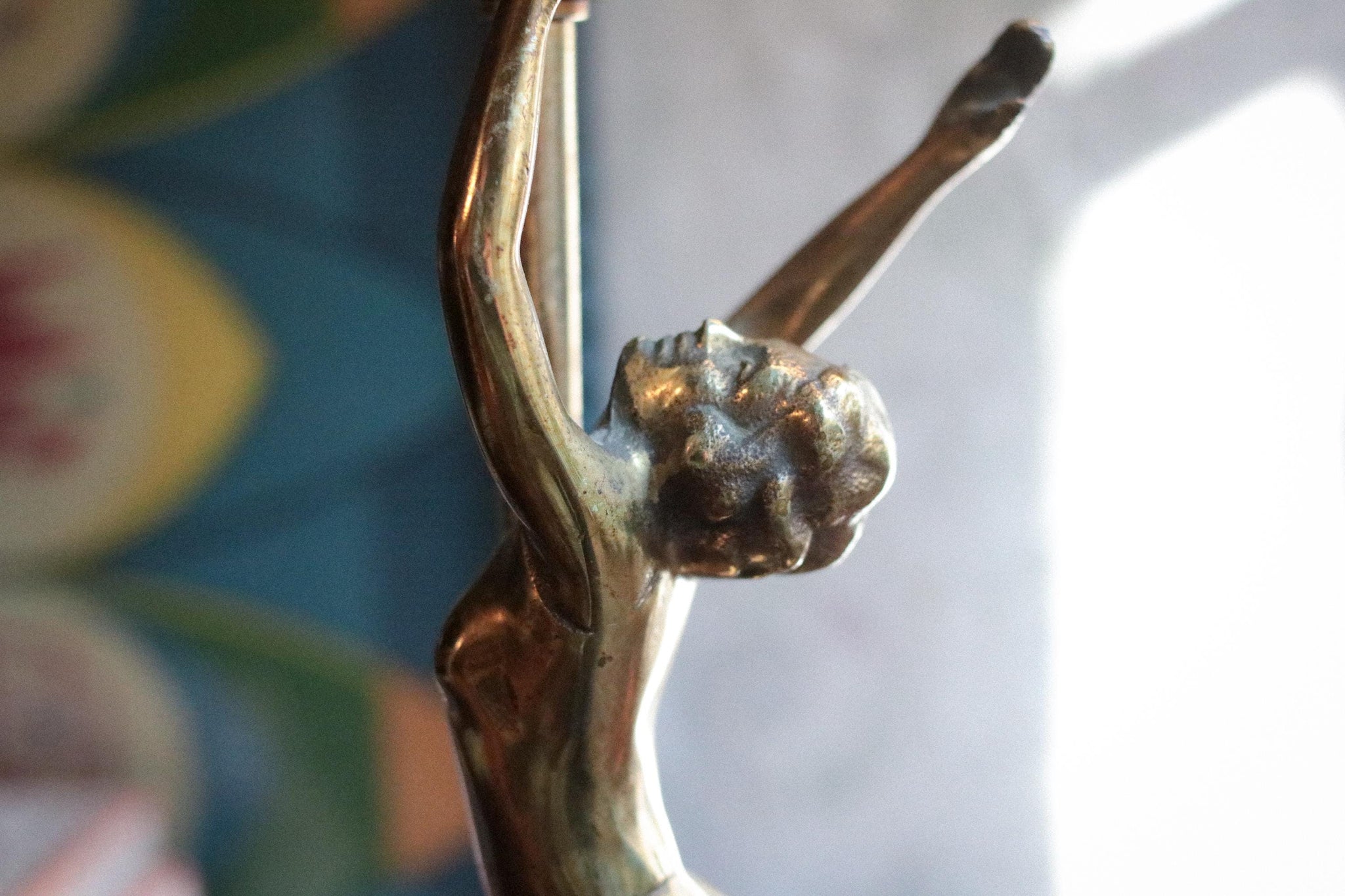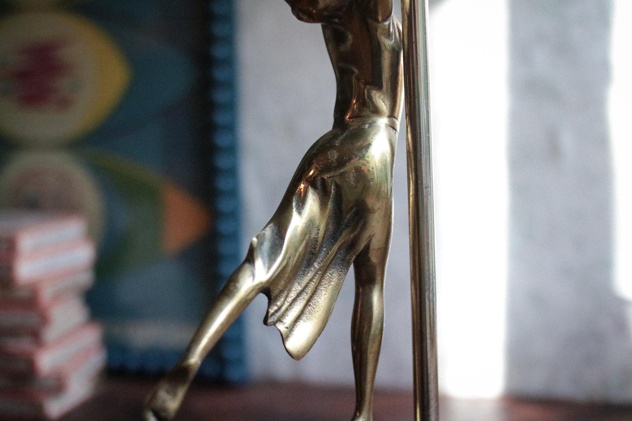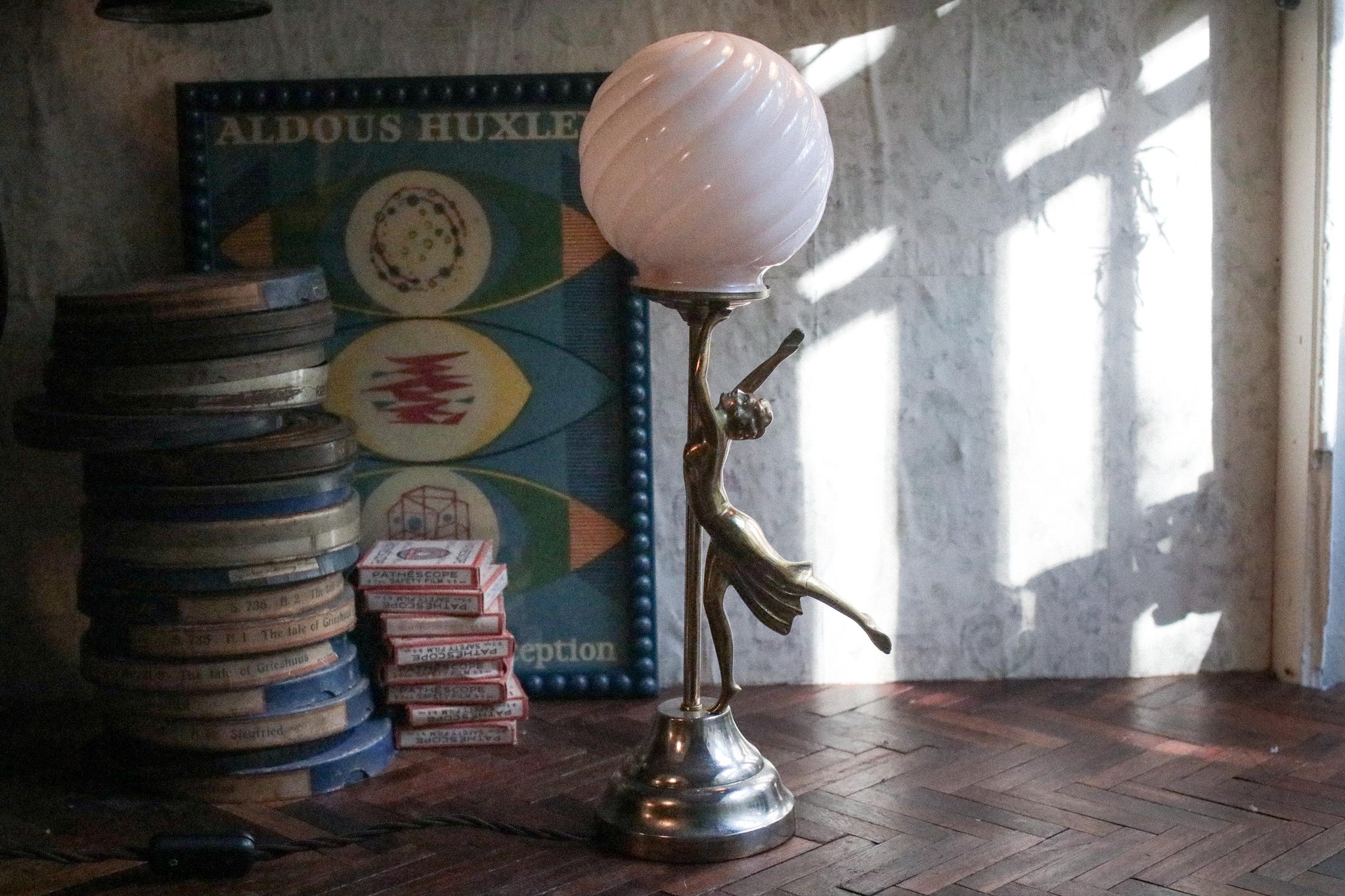 This elegant Art Deco style bronze lamp features a beautifully sculpted dancing female figure poised gracefully beneath a swirled opaline glass globe shade. The piece captures the poise and glamour of the 1920s–30s era, with fine detailing in the flowing dress and extended form of the dancer. The warm metallic finish has developed a gentle patina, enhancing its vintage character.