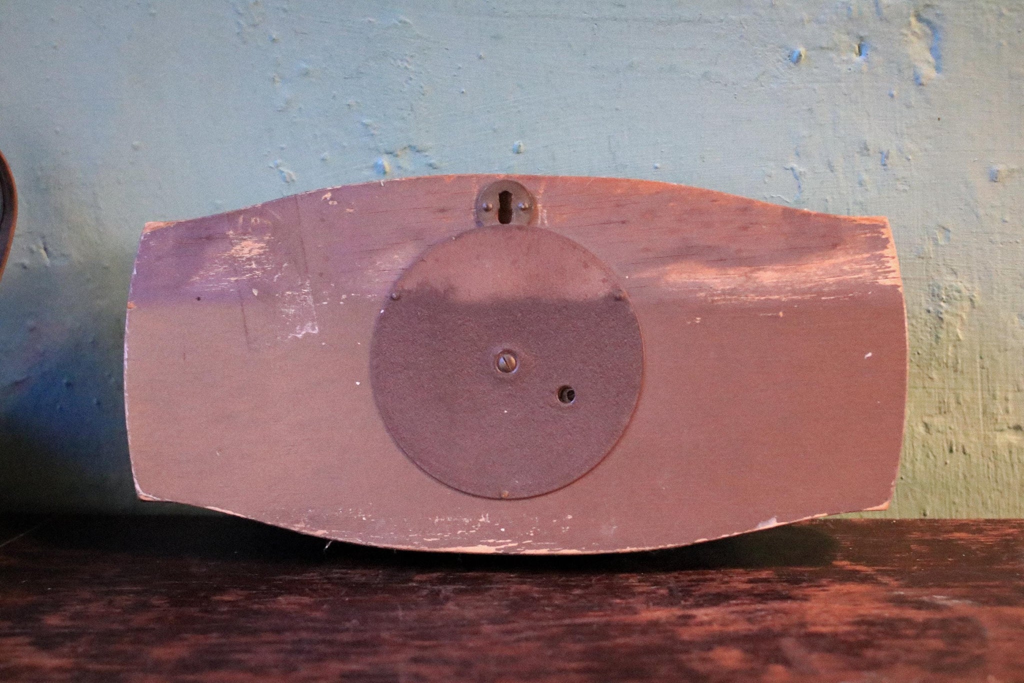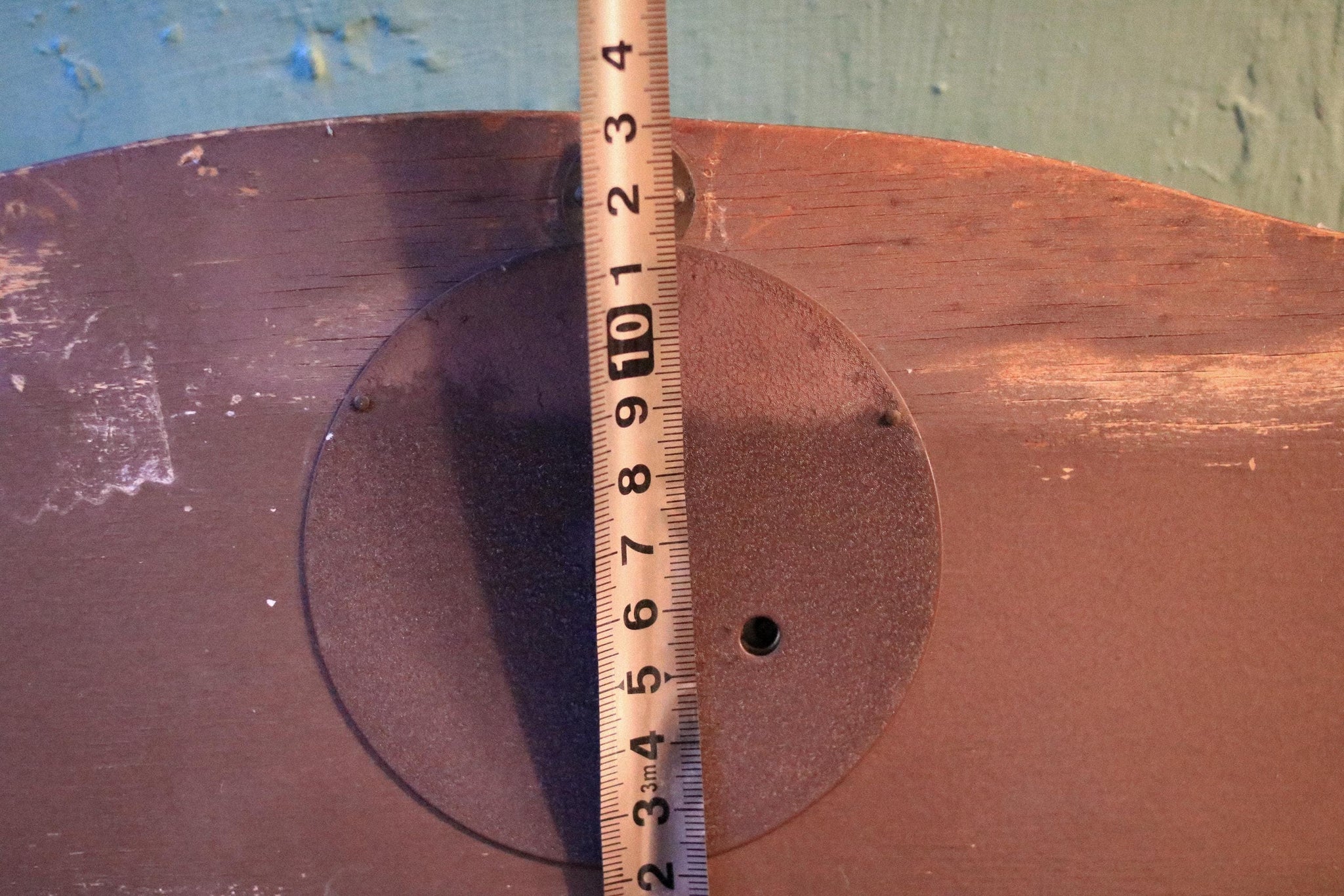 Measures approx 26.5 x 13 cm (approx 10 7/16" x 5 1/8"). Condition is good vintage with honest age wear: light scuffs/marks to the wood, patina and surface wear to the brass and metal surrounds, and typical signs of use. In good working order.