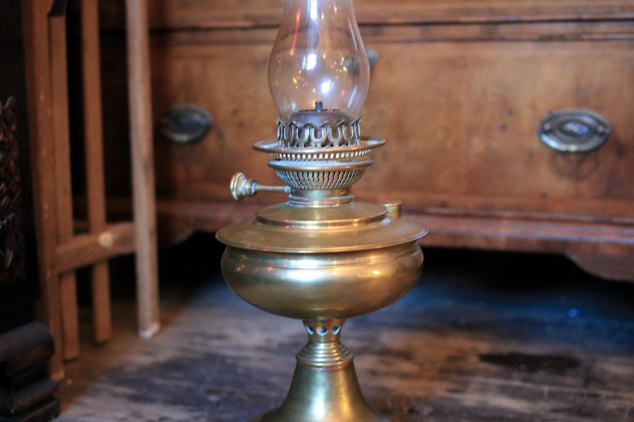 A beautifully proportioned vintage brass oil lamp with a classic baluster base, adjustable wick burner and a tall clear glass chimney, giving off that warm, moody glow that modern lighting can’t fake. The burner is marked Globe Lighting, and the lamp is in working order, making it ideal as a functional piece as well as a styling object. This is exactly the kind of “old-world practical” decor that’s trending hard right now across dark academia, cabin-core and collected interiors—perfect on a sideboard, writing desk, bedside table, or layered into a vignette with books, bronze, and worn wood.