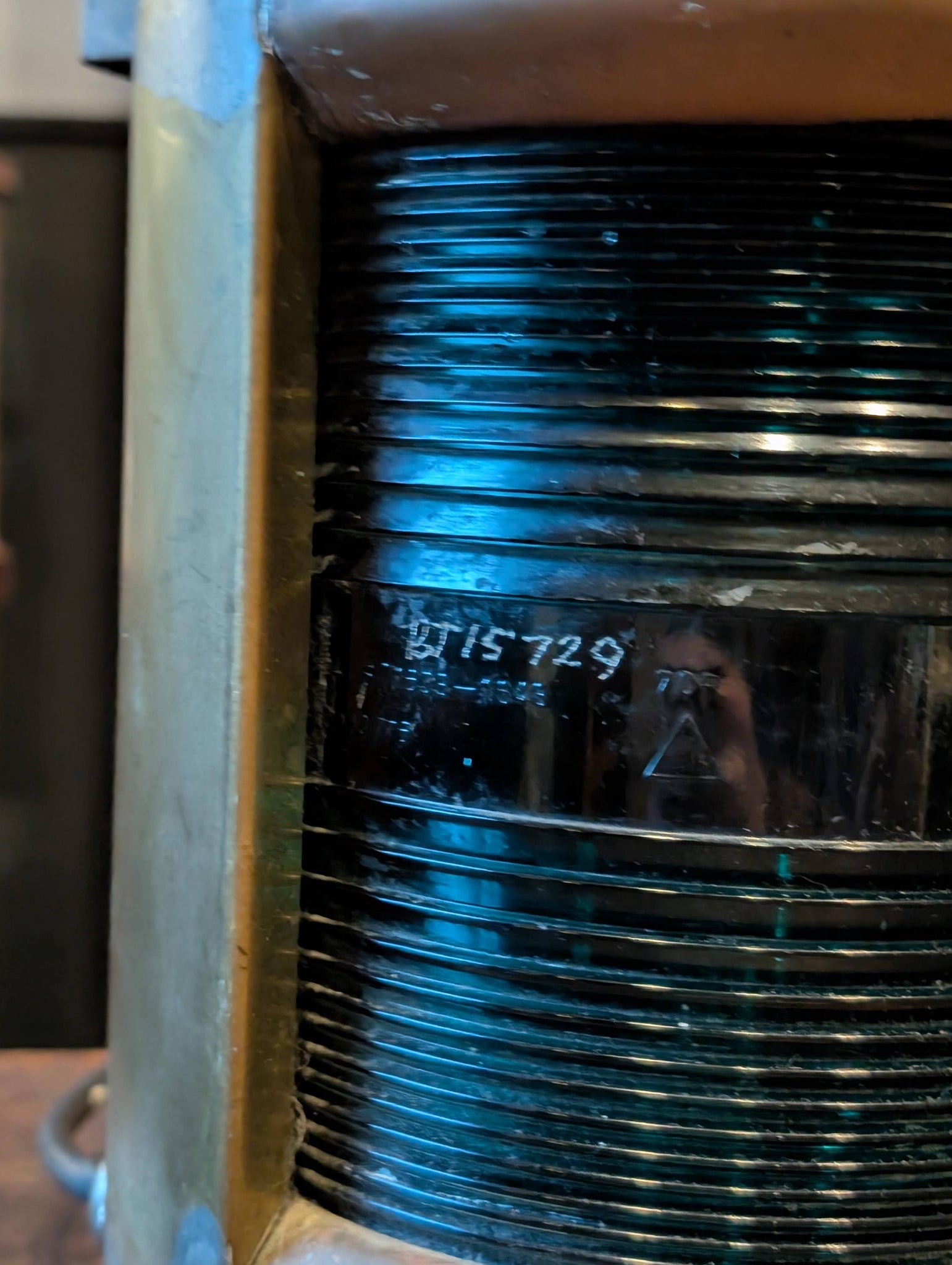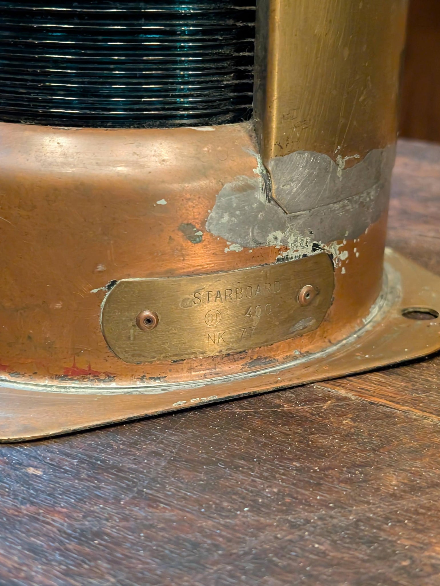 Handsome vintage brass ship’s navigation light, originally a starboard lantern with a deep green ribbed glass lens and heavy brass casing, now sensitively converted for interior use. The cylindrical body has a great industrial feel with layered solder repairs and working hardware, topped with a hinged carrying handle so it still looks every inch like it just came off a working vessel. Inside is the original reflector and lamp mount, now fitted with modern wiring so it functions safely as a characterful table or floor lamp.