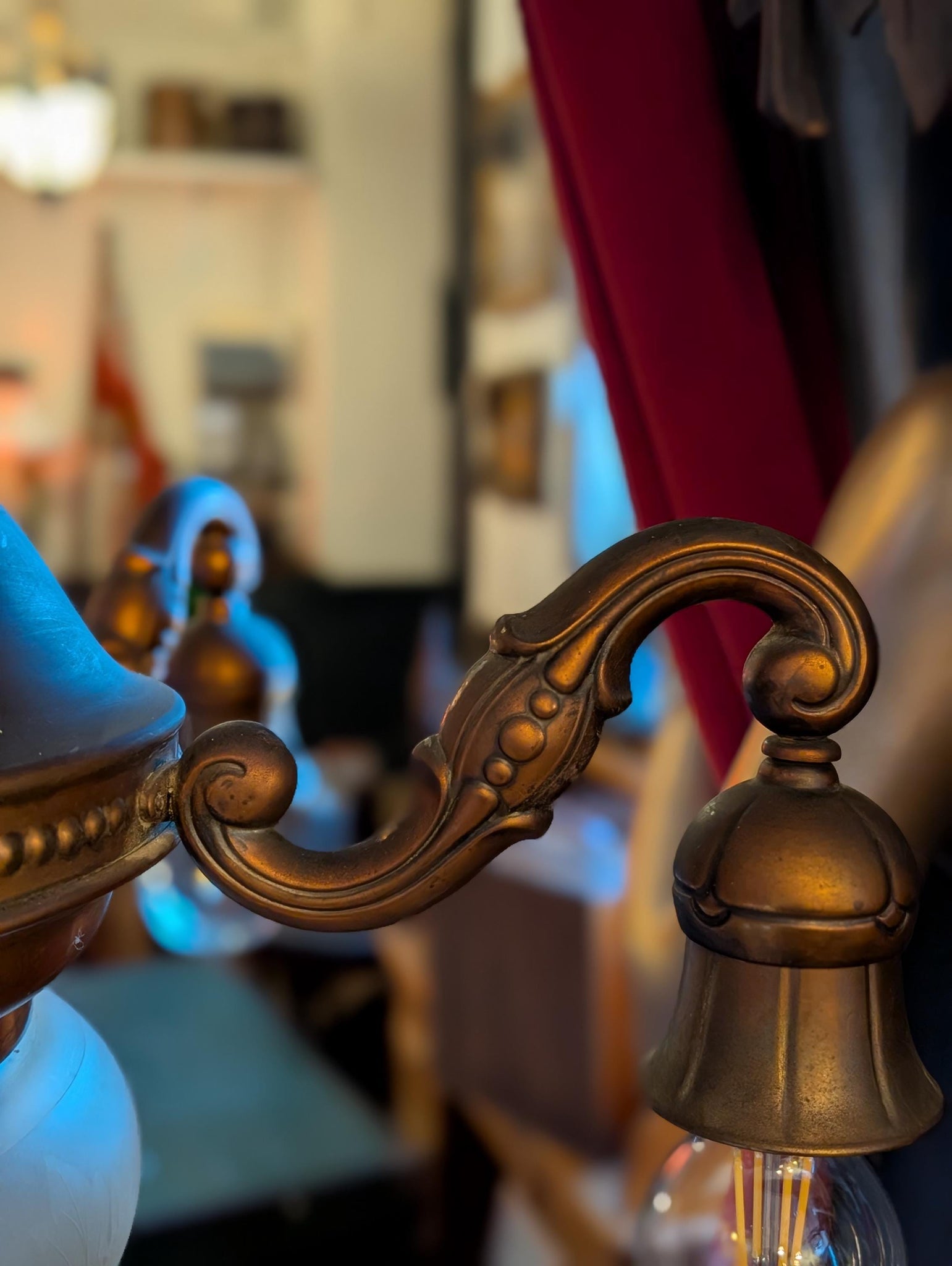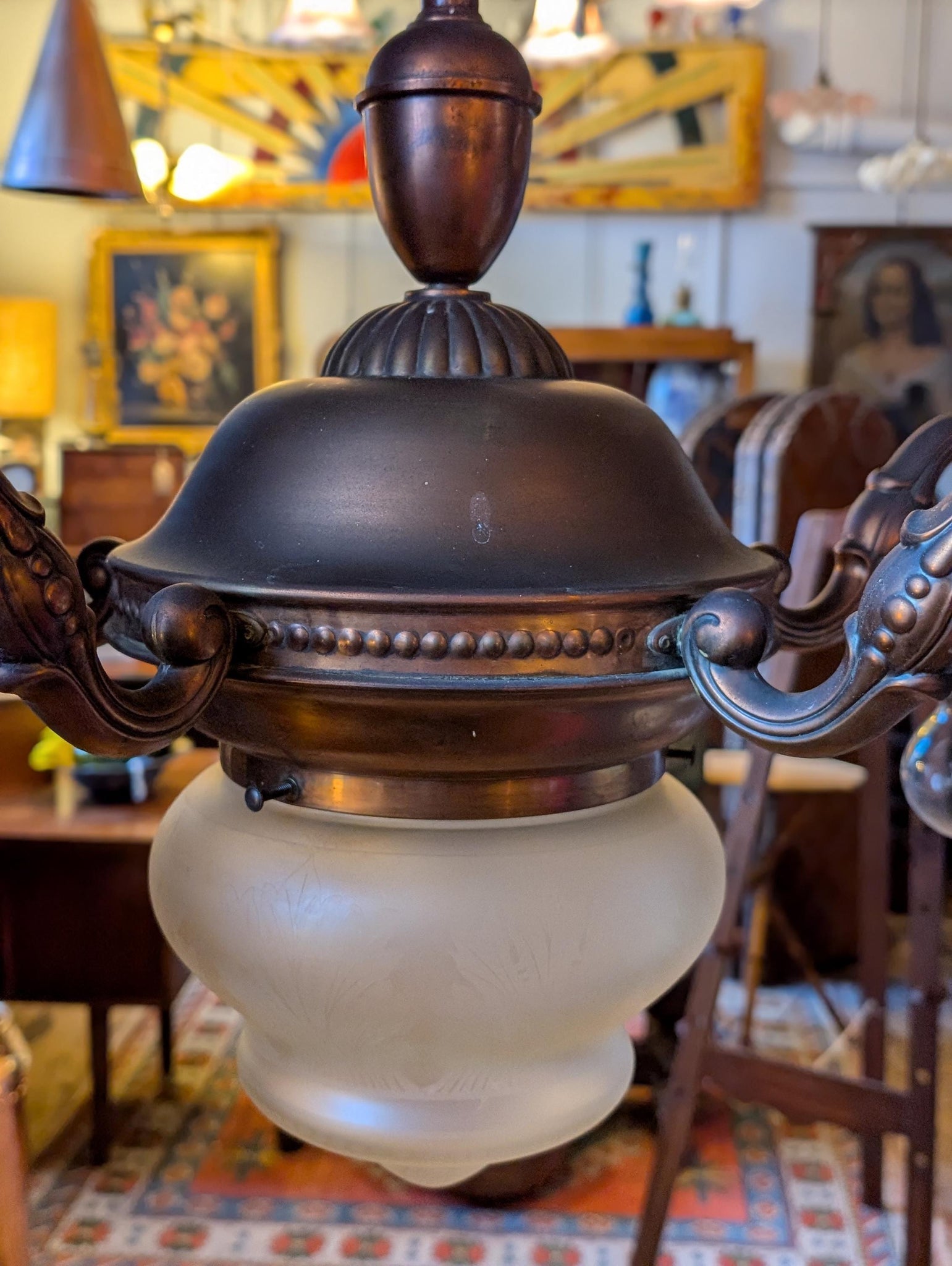A gorgeous statement ceiling light with a warm antique-brass tone, beaded gallery detailing and four scrolling arms, finished with a substantial frosted glass bowl shade with a delicate etched motif. It’s exactly the kind of piece that hits the current “old money / grandmillennial” interior trend—classic, architectural, and a little theatrical over a dining table, in a hallway, or in a library-style room.