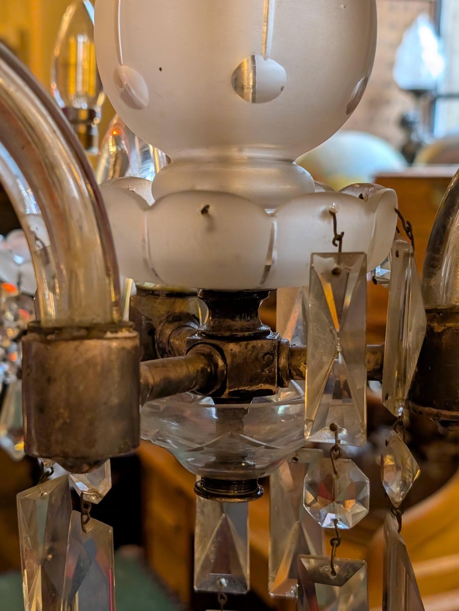 Condition: a couple of the crystal drops are missing, and there’s a piece missing of one of the glass cups that sit on the end of the arms but it isn't very noticeable when installed. Please see photos and feel free to ask if you want specific close-ups. Tested and in good working order.