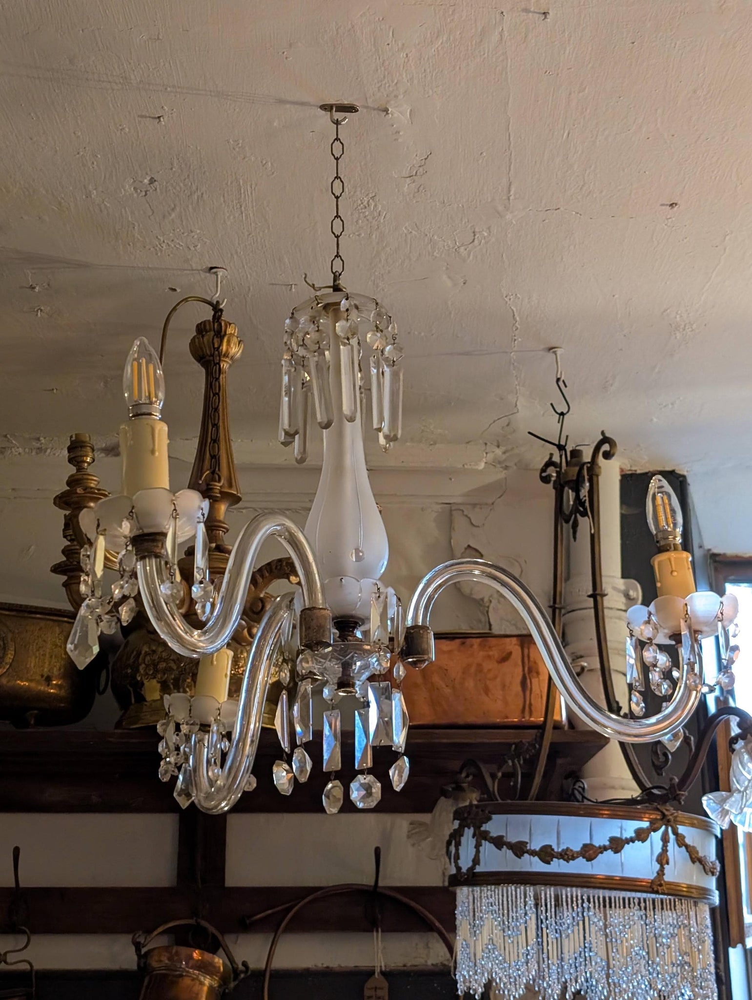 A sparkling statement light with sweeping chrome arms, candle-style sockets, a frosted glass central stem, and faceted crystal drops that catch and scatter light beautifully. It has that boutique-hotel glamour that’s very on-trend right now—old money meets grandmillennial/Regency revival—ideal for an entryway, powder room, bedroom, dressing space, or over a small table where you want instant atmosphere.