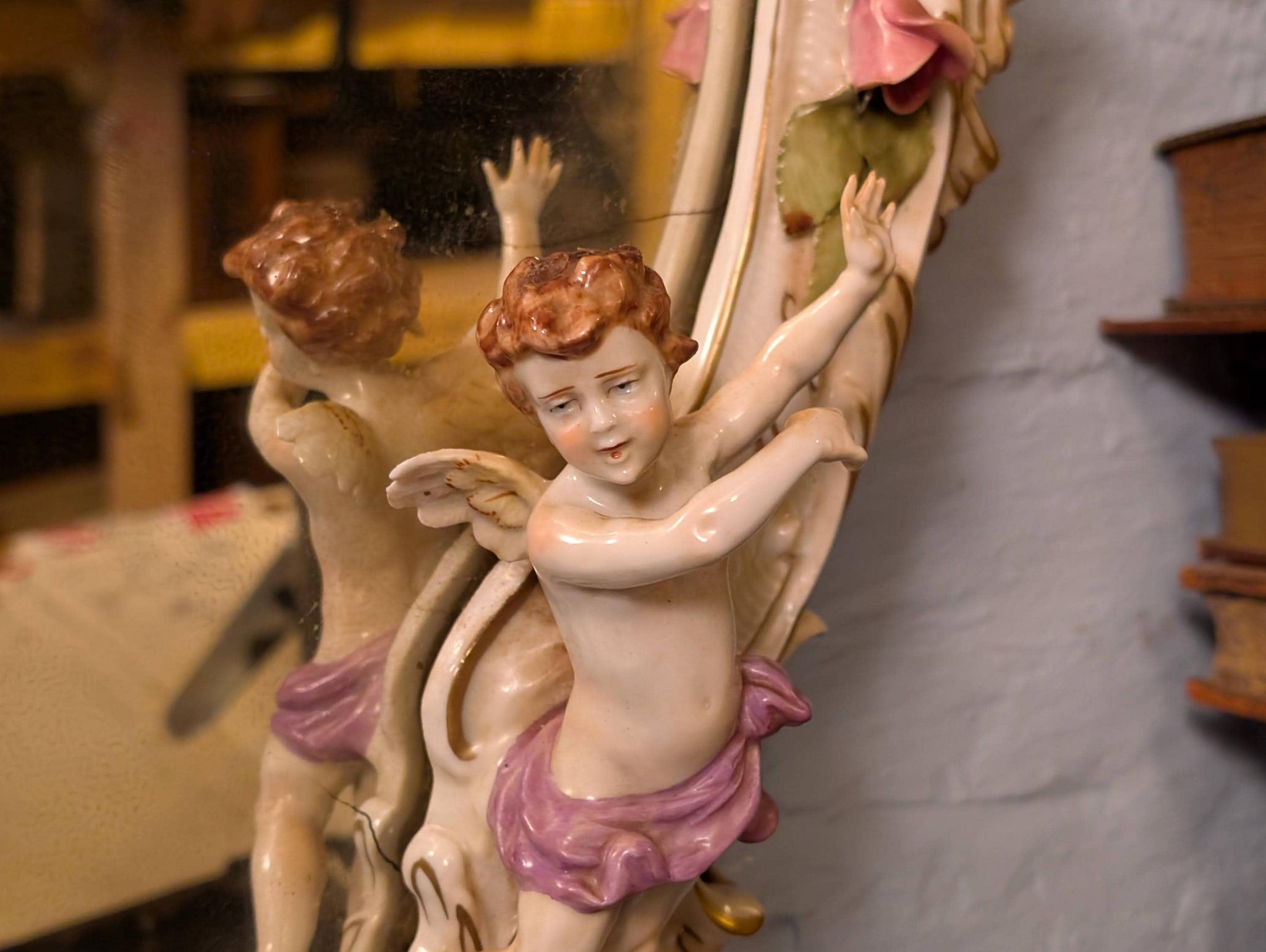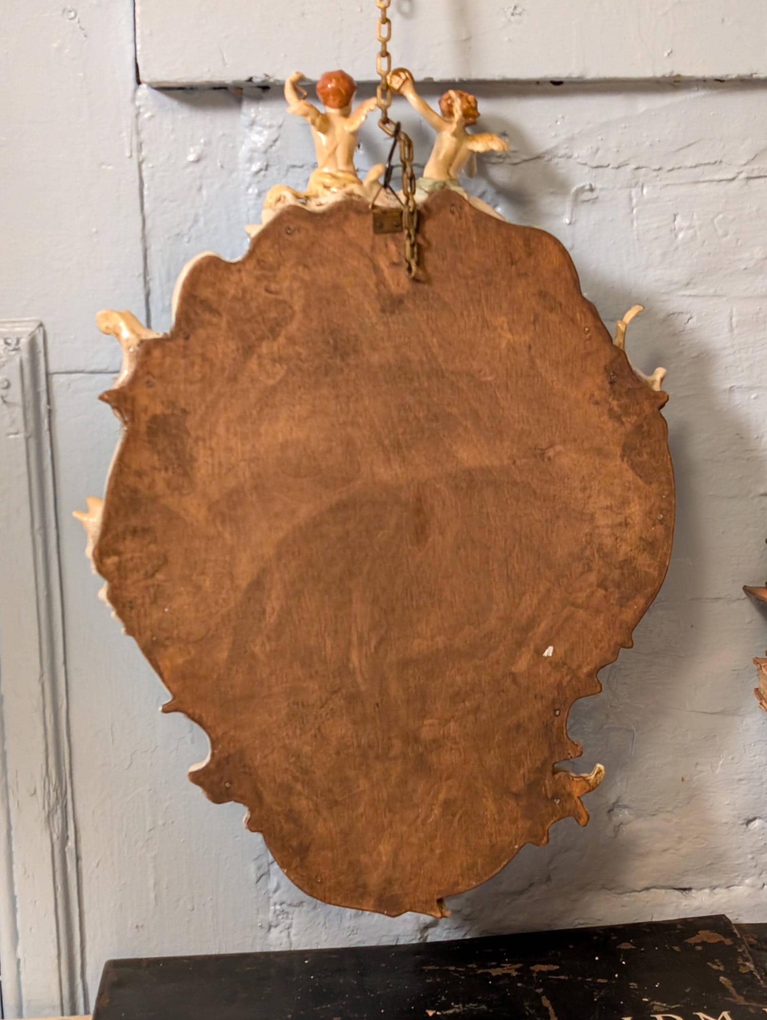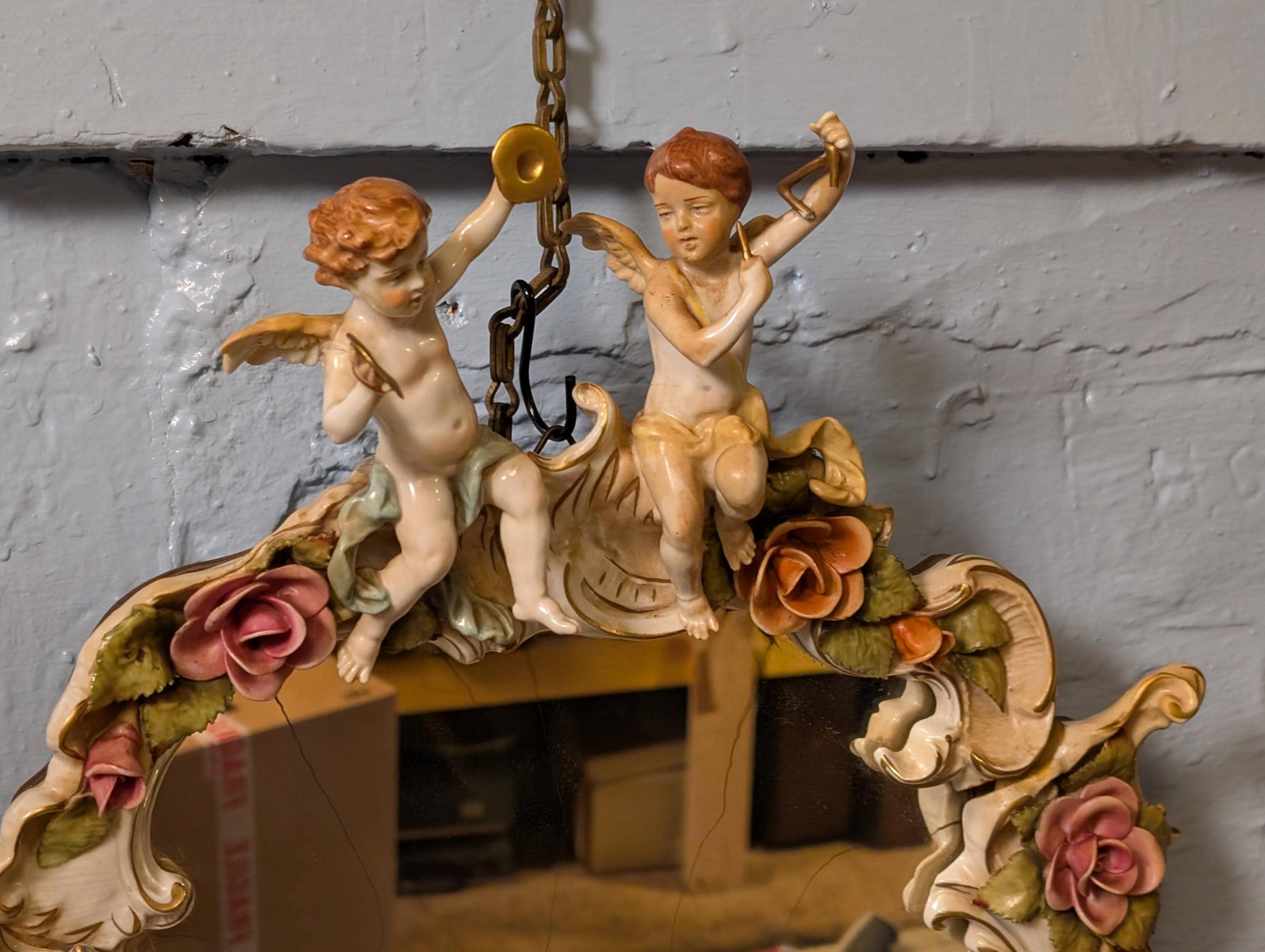 An absolutely charming hand-painted porcelain wall mirror, richly modelled with scrolling Rococo-style flourishes, applied rose garlands, and four putti/cherubs (two seated at the crest, two at the lower sides). Marked to the rear with a crowned VNP 1817 and “Made in GDR / handpainted,” making it a lovely East German decorative piece with that romantic, ornate look that’s right on-trend for Castlecore / Grandmillennial Rococo Revival interiors.