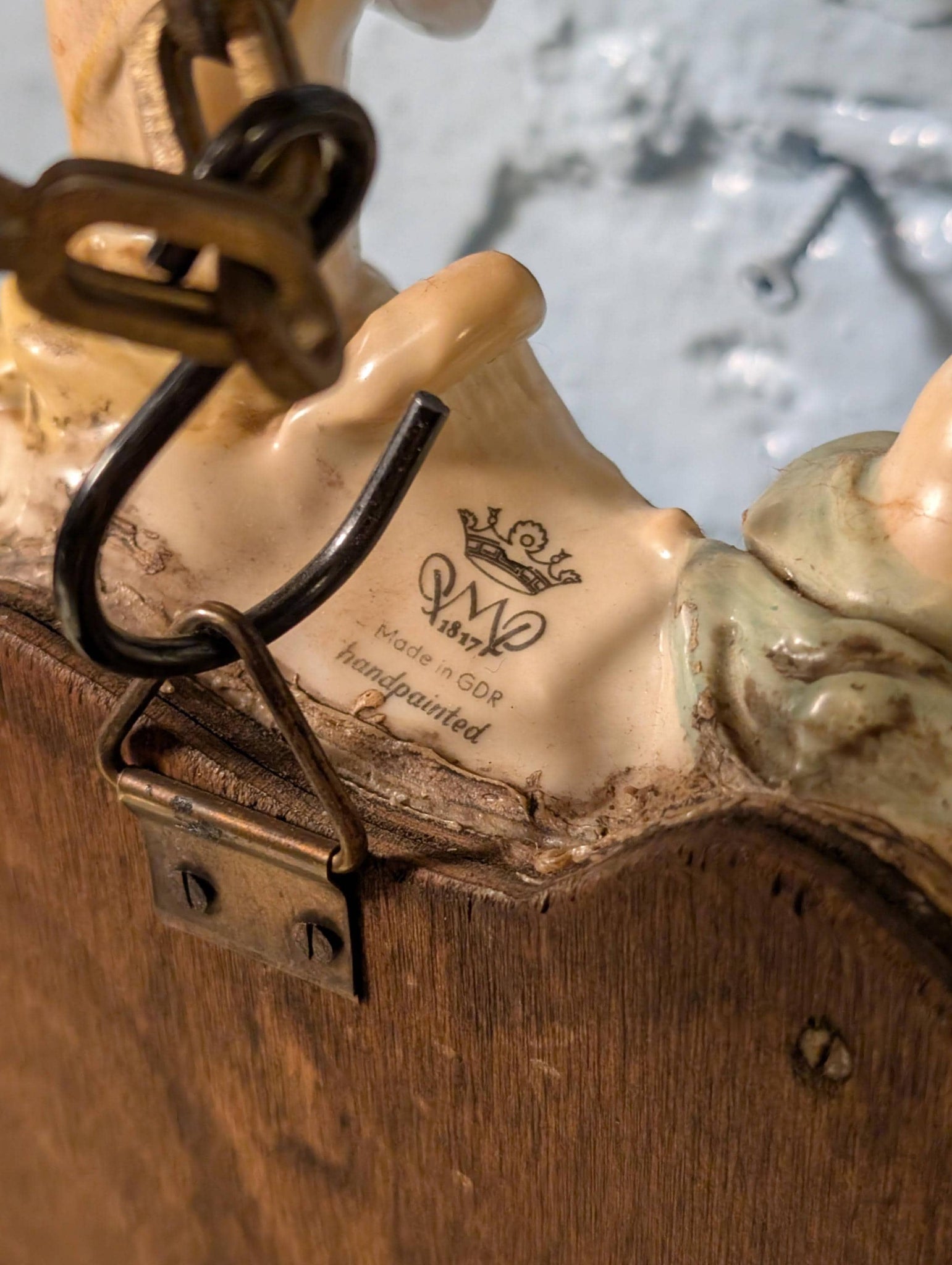 Condition notes: there’s visible age/wear to the wooden backboard and some old adhesive/residue around the rear edge by the fixing points (please see photos). The porcelain decoration shows typical light age wear.