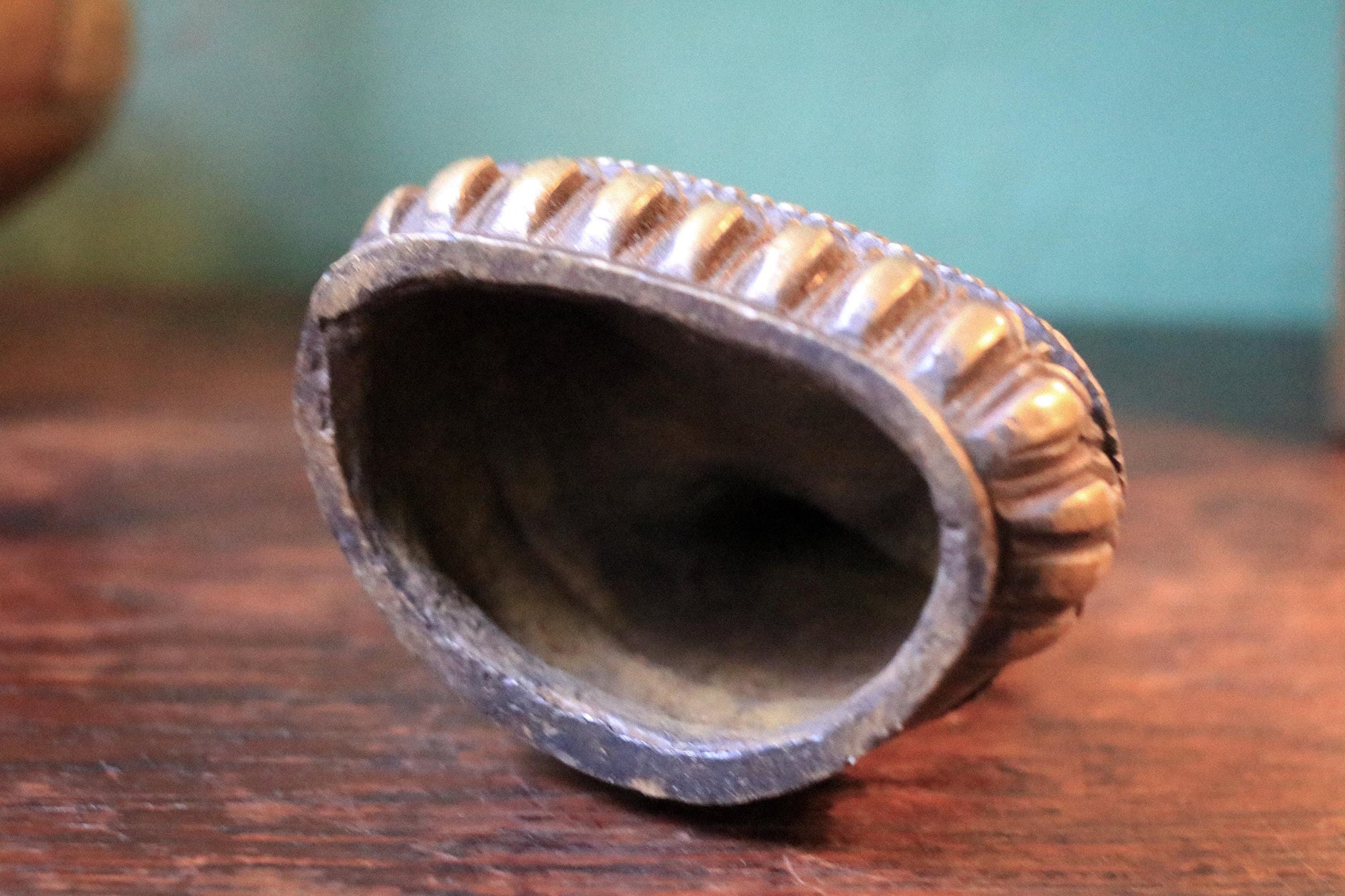 Small but weighty vintage cast bronze Buddha, seated in meditation on a lotus base with one hand raised in blessing. The figure has fine incised detailing to the robes and hair and a mellow, darkened patina from age and handling, with warmer brass tones catching the light on the raised areas. It stands at approximately 10 cm high (around 4 inches), making it a perfect size for a small home altar, bookshelf vignette or desk companion, and it sits especially well in Japandi, wabi-sabi and boho interiors where a touch of calm, old-world metalwork works beautifully.
