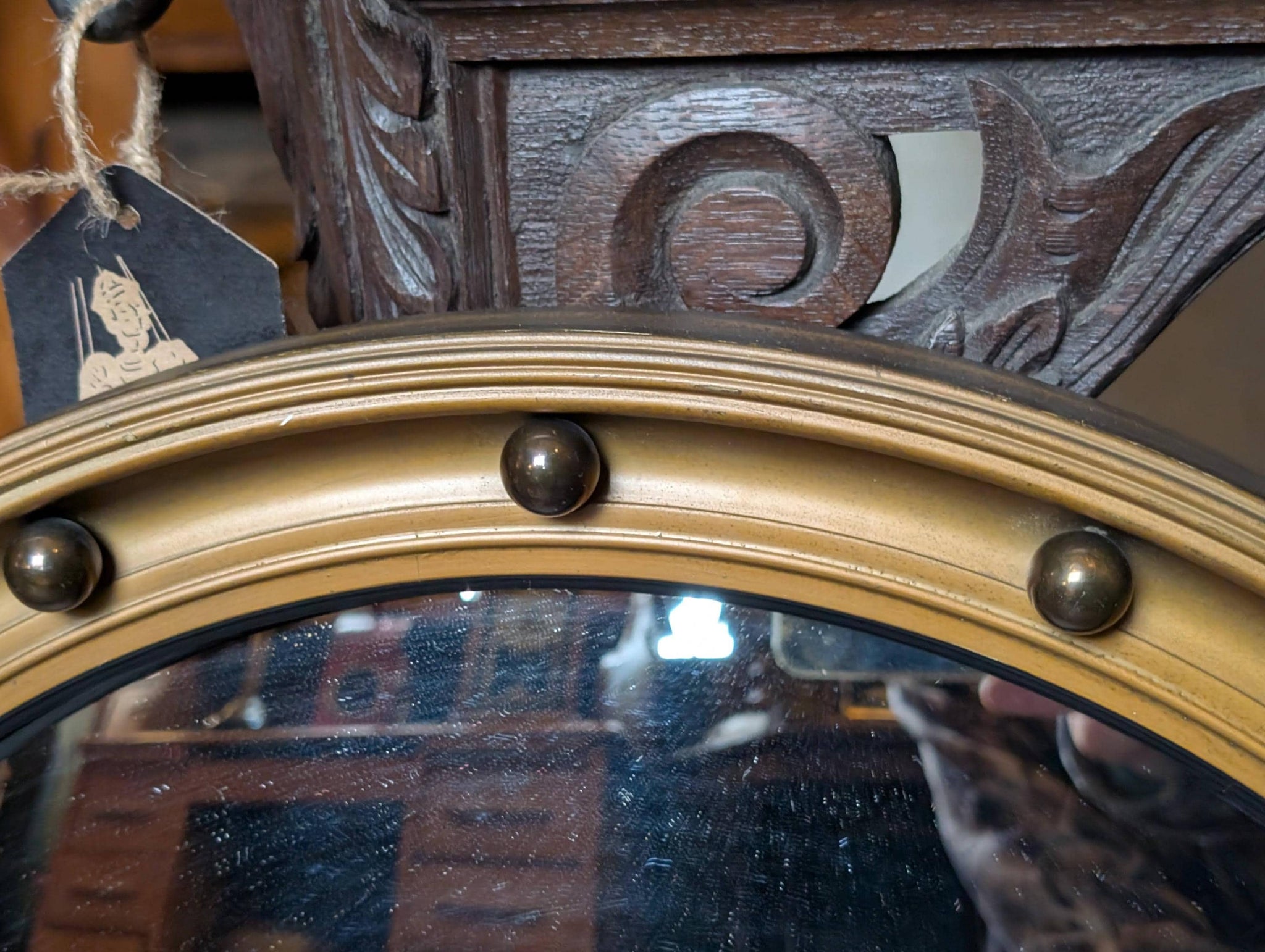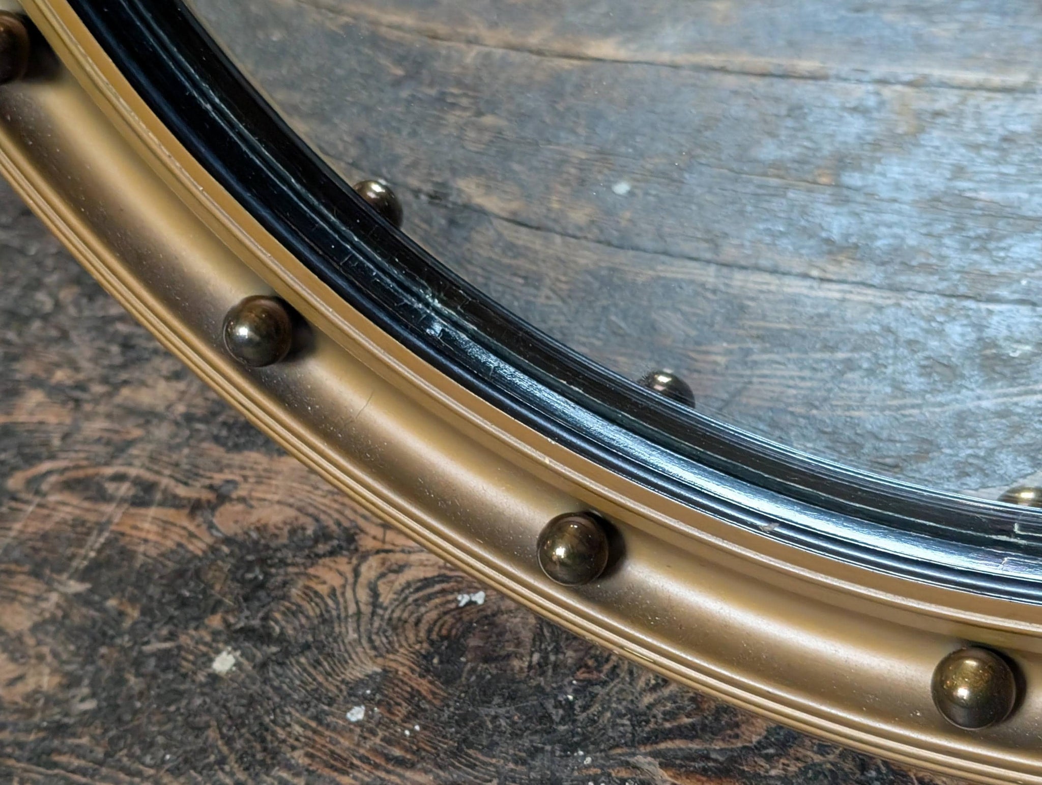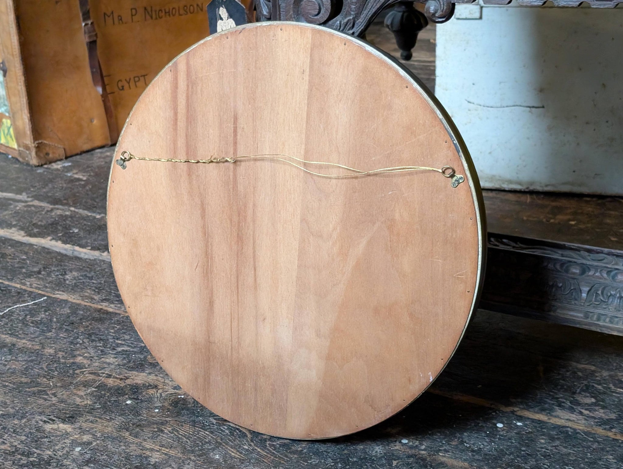 Proper classic Butler’s mirror—round, gently convex glass with a warm gold-toned frame and stud detailing that gives it that elevated “drawing room” look rather than anything overtly themed. It’s the kind of piece that instantly lifts a hallway, above a mantel, or in a layered gallery wall, and it sits perfectly in the current Regency revival / Grandmillennial / Old Money interior wave.