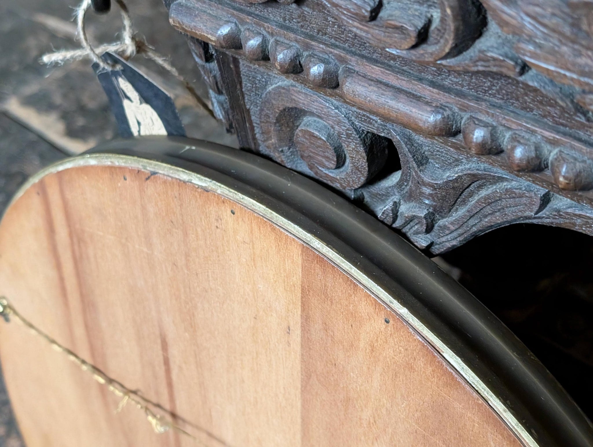 Diameter is 49 cm (19.3 in). Condition is vintage with age-related marks to the glass and surface wear to the frame in places, but it presents really well on the wall with loads of character.