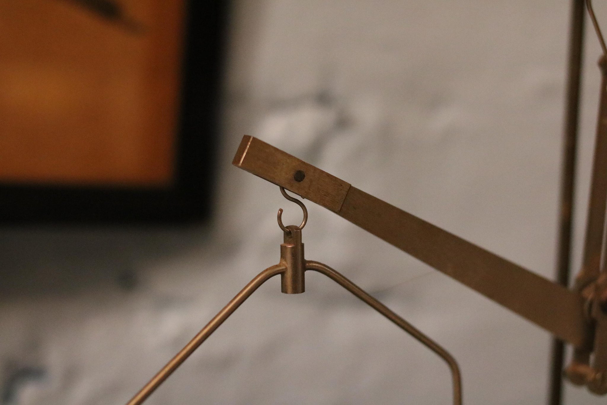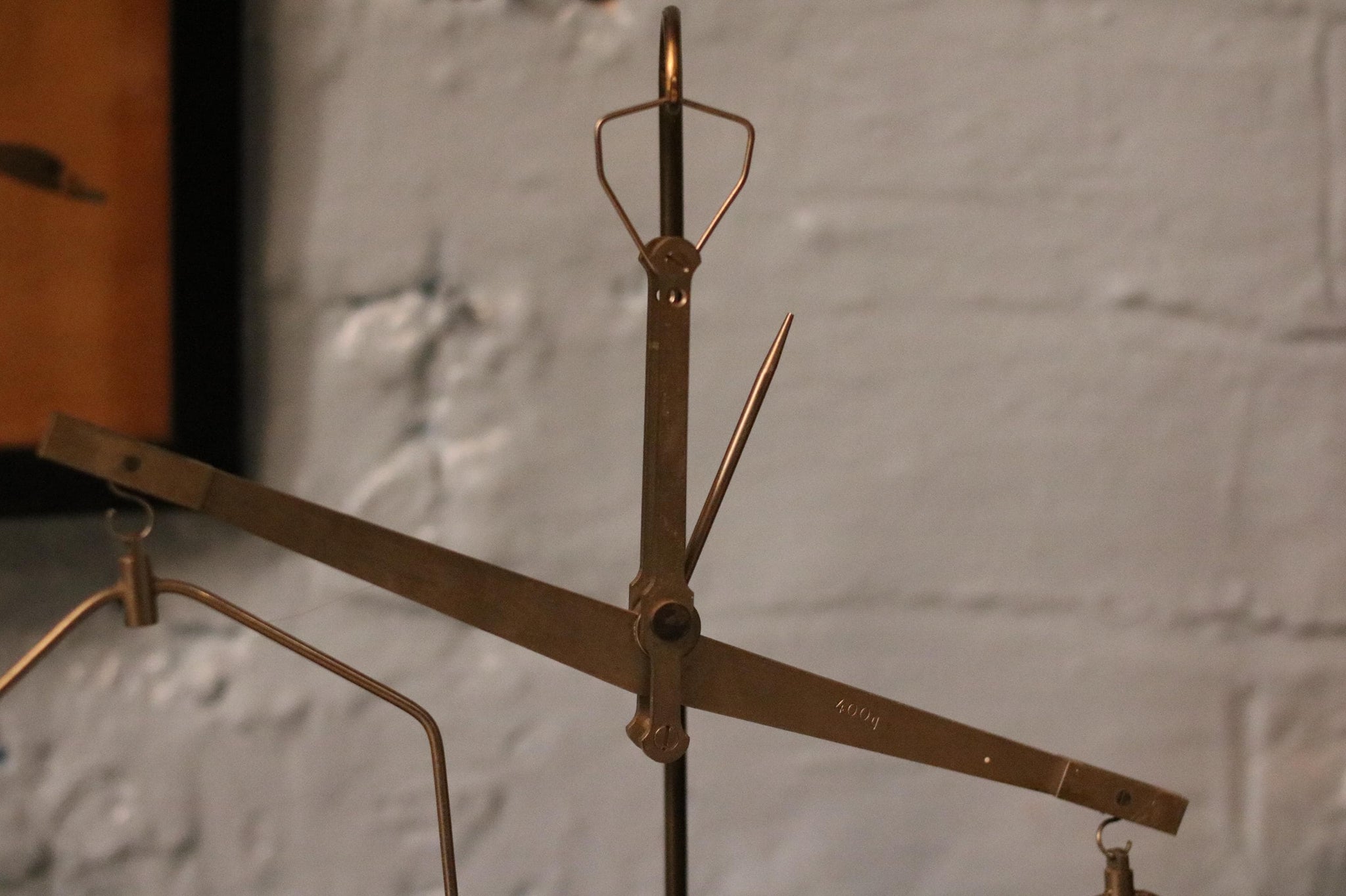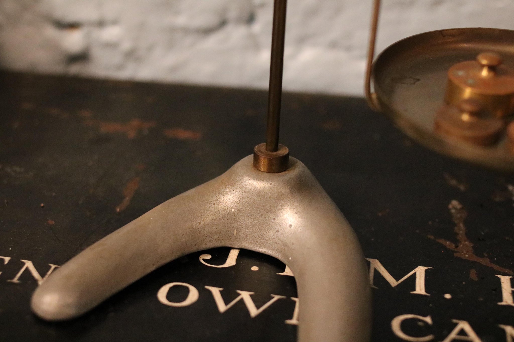 Standing at approximately 42cm (16.5") tall, the scale has a sturdy three-footed base and comes with two removable pans and a few original brass weights, as shown. The pointer arm moves freely, and the whole piece displays beautifully. Ideal for styling in a study, shop display, or simply as a curious object with a sense of equilibrium and symbolism.