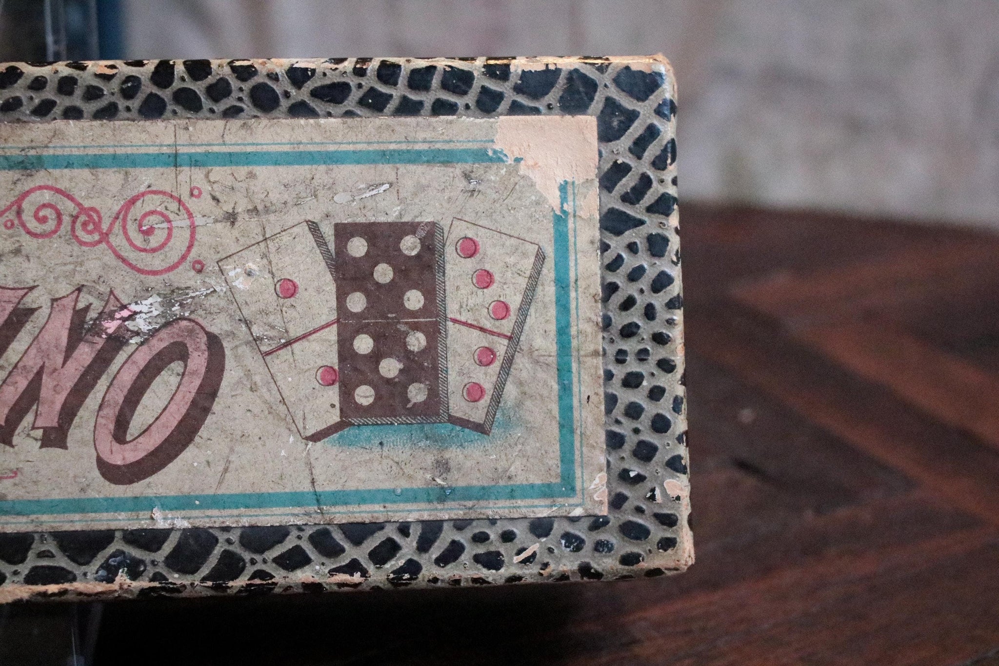 A charming early 20th-century complete double-six set (28 tiles) with richly embossed black backs and creamy inset pips. The tiles sit in their original card box wrapped in faux-reptile paper, the lid with a litho “Domino” panel and romantic vignette—pure parlour-game nostalgia and a lovely styling piece for shelves and coffee tables.