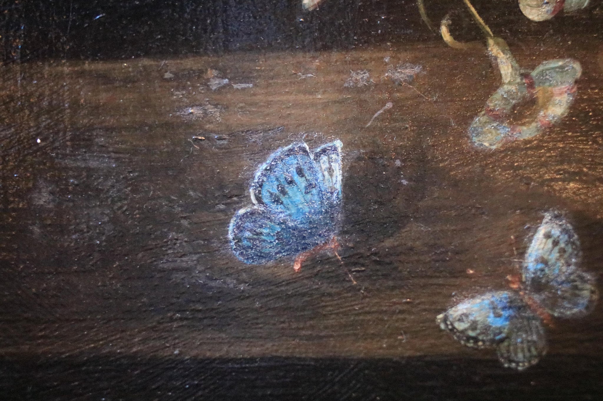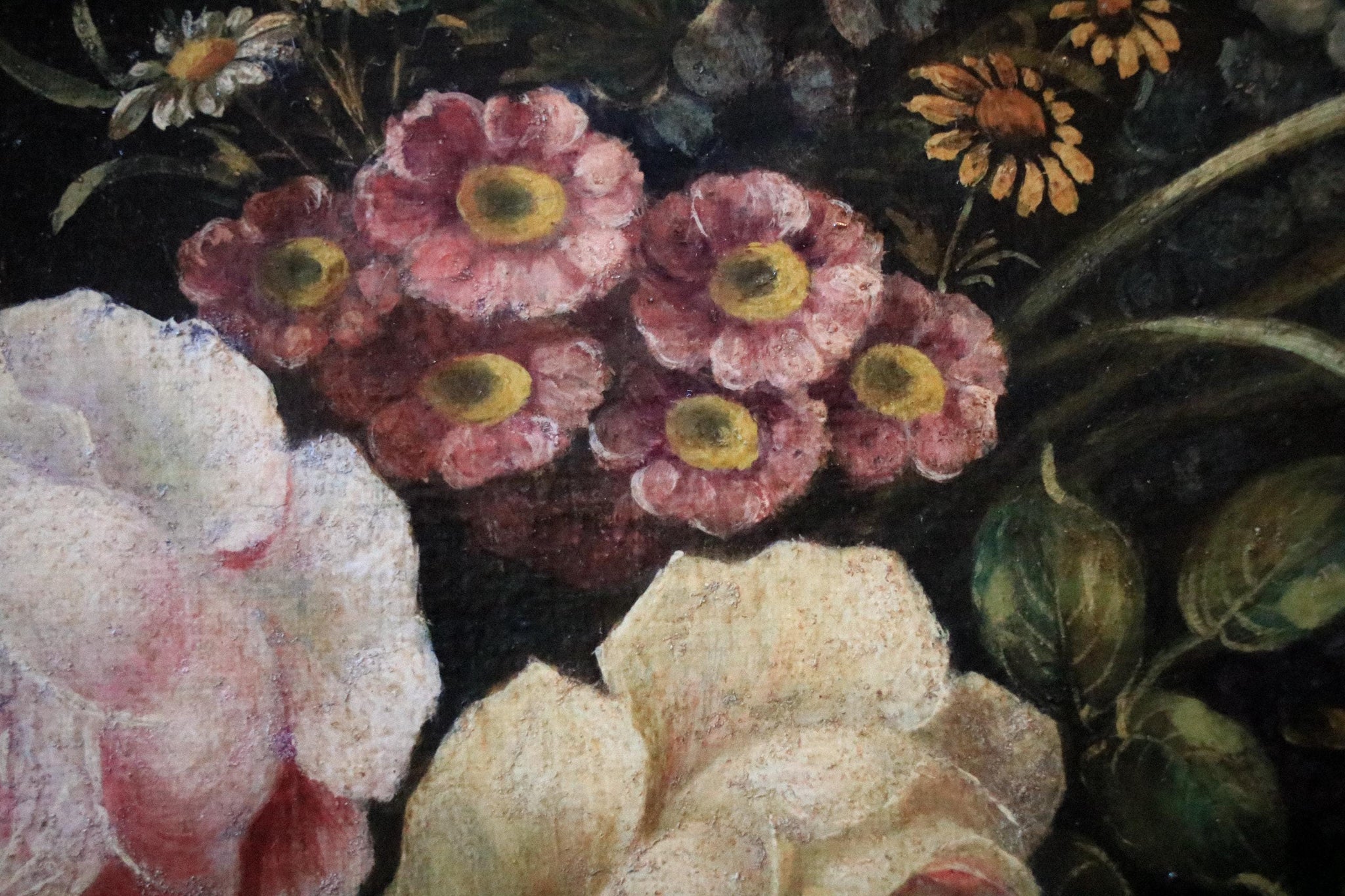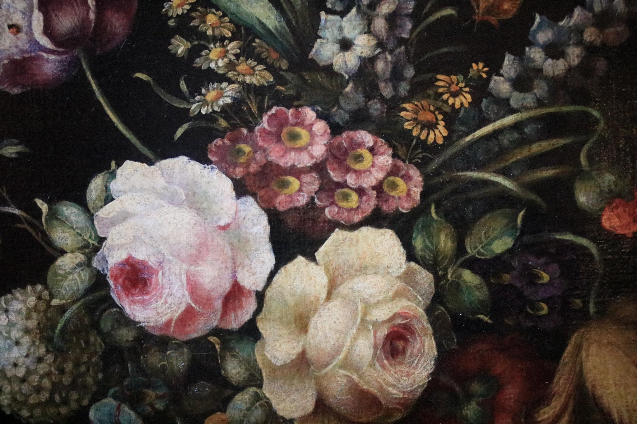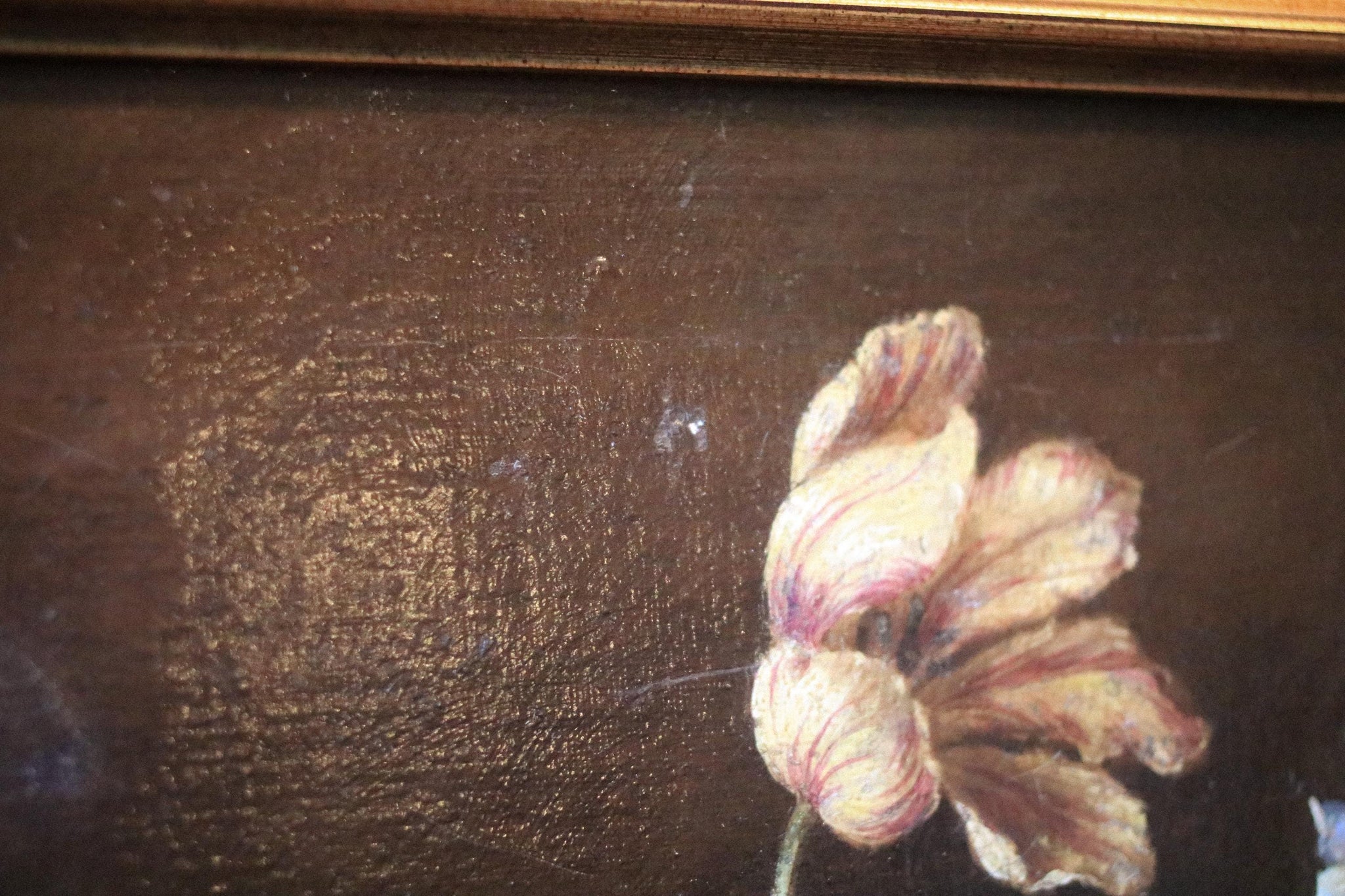 Rich, moody and romantic, this vintage oil-on-canvas floral still life has all the drama of an Old Master painting. A densely packed bouquet of roses, tulips and wildflowers glows out from a deep, dark ground, with tiny butterflies and foliage adding movement and detail. The colours are beautifully aged and slightly muted, giving that authentic old-money, grandmillennial feel that works perfectly in a cosy library corner, above a fireplace or as the anchor piece in a maximalist gallery wall.