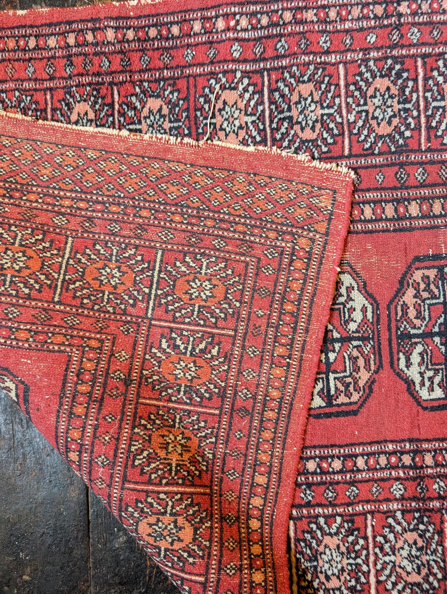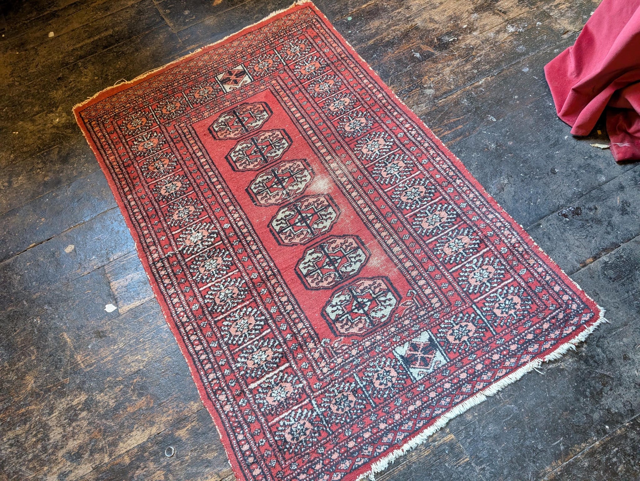 A traditional Bokhara-style rug, hand-knotted in rich red wool with repeating Tekke gul medallions arranged in rows. The field is framed by intricate geometric borders featuring stylised floral motifs and diamond lattice work. This piece has an authentic worn patina consistent with age, including visible fading and pile wear at the centre, giving it a lived-in character that suits rustic or eclectic interiors.