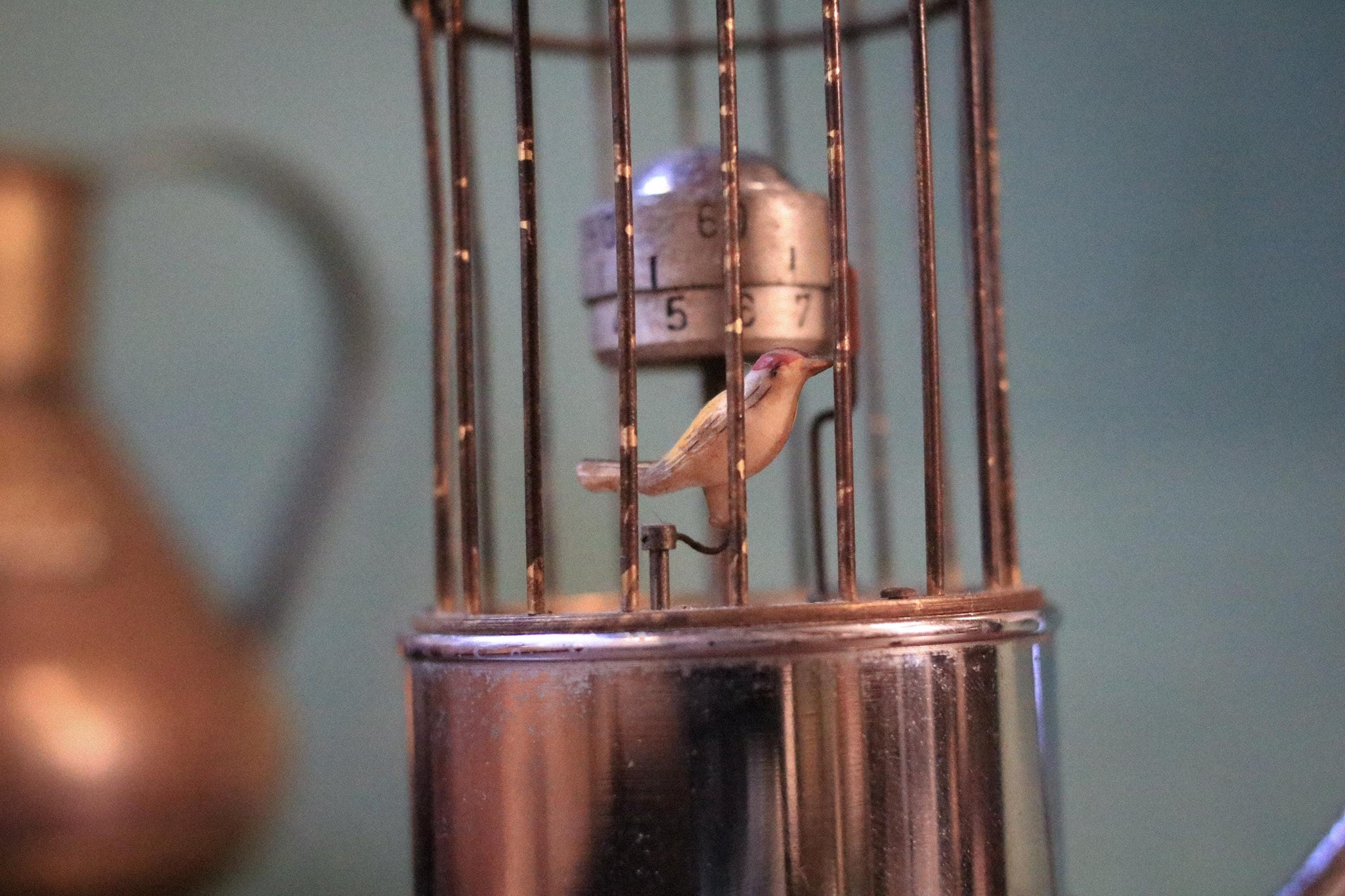 A wonderfully quirky vintage tabletop clock by Kaiser (marked “Kaiser Foreign”), designed as a miniature hanging birdcage with a little bird inside, suspended from a sleek chrome swing arm and base. It’s the kind of piece that instantly upgrades a shelf, bar cart, or desk—perfect for the current dark academia / grandmillennial styling trend where one standout mechanical curiosity becomes the conversation starter.