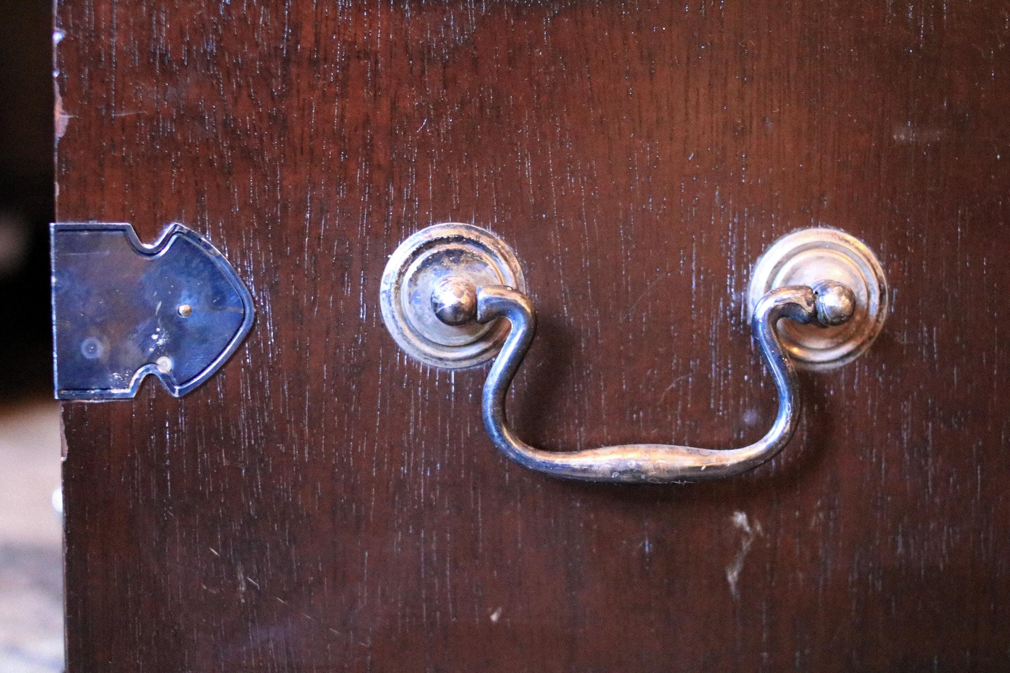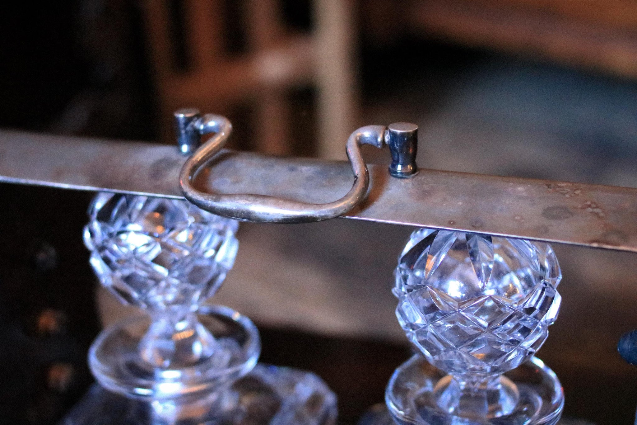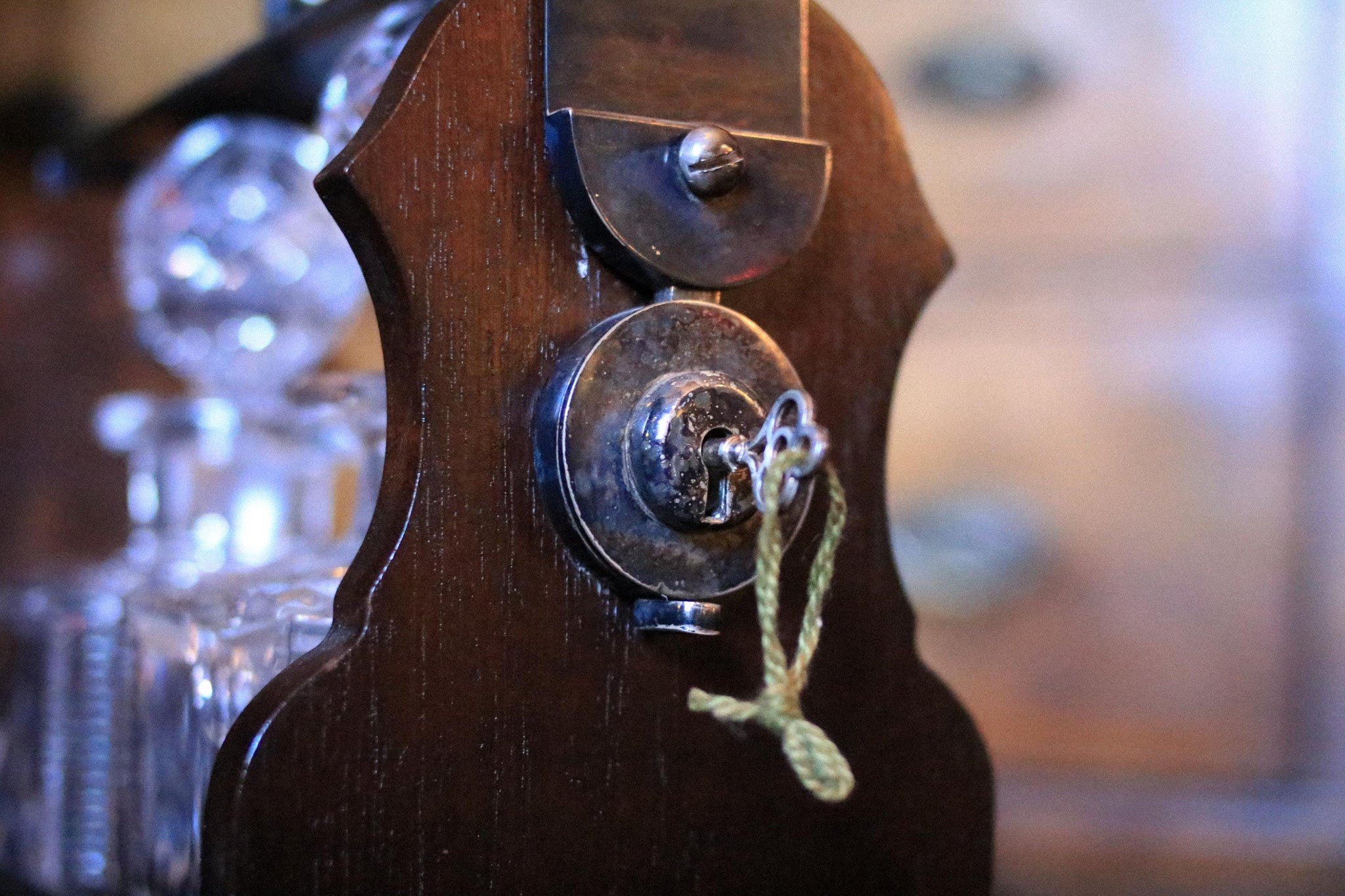 A seriously cool antique spirits caddy / tantalus-style decanter box with a proper “gentleman’s cabinet” vibe. The dark stained wooden case has a hinged lidded compartment lined in green felt (housing the two cut-glass tumblers), twin cut-glass decanters with faceted stoppers held in the upper frame, and a lower drawer with a hidden locking trick: when you remove the left-hand decanter, the mechanism releases and the drawer unlocks. It also comes with the key. Perfect for an old money bar cart setup, a dark academia study, or a speakeasy-style drinks corner.