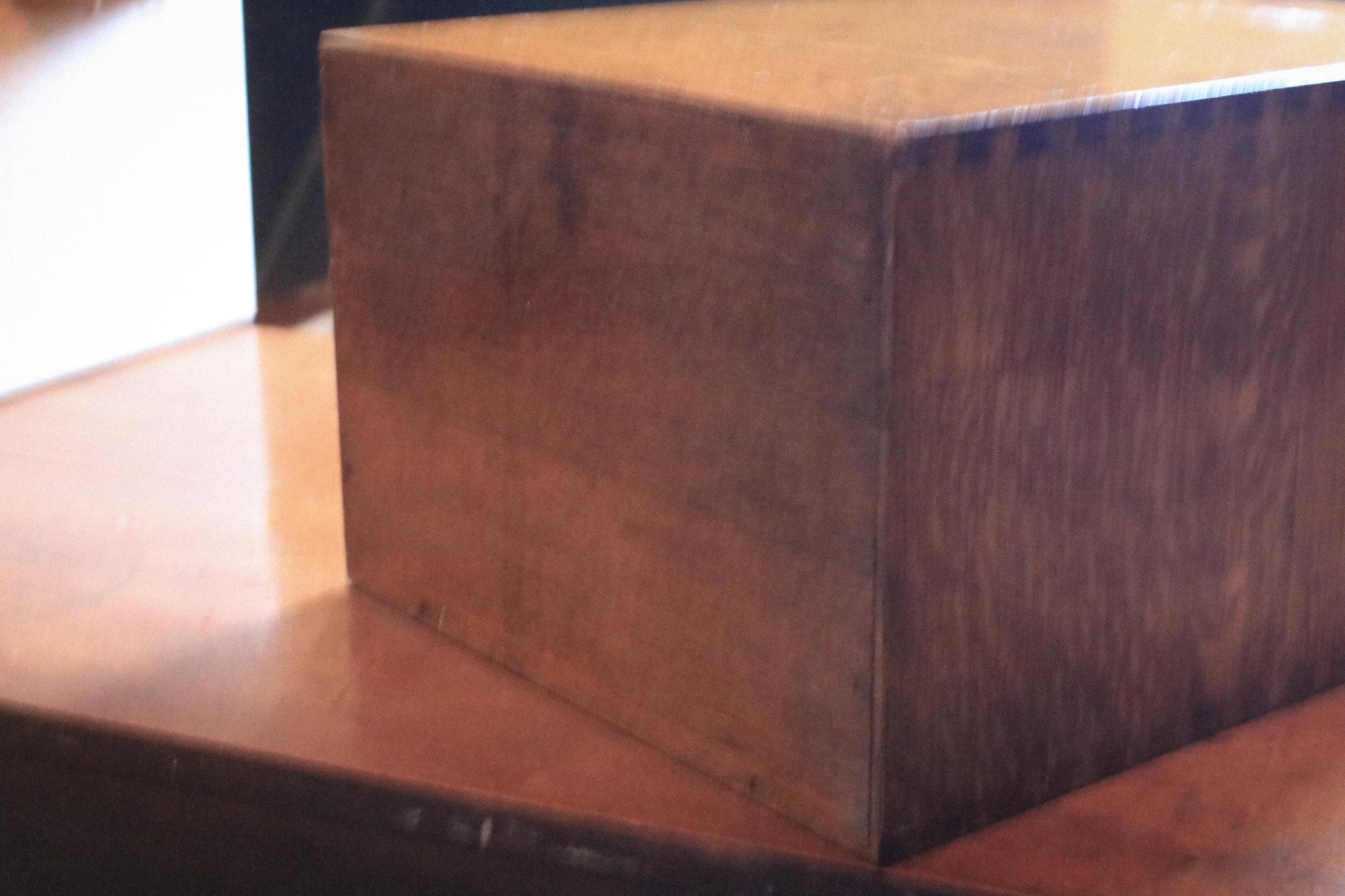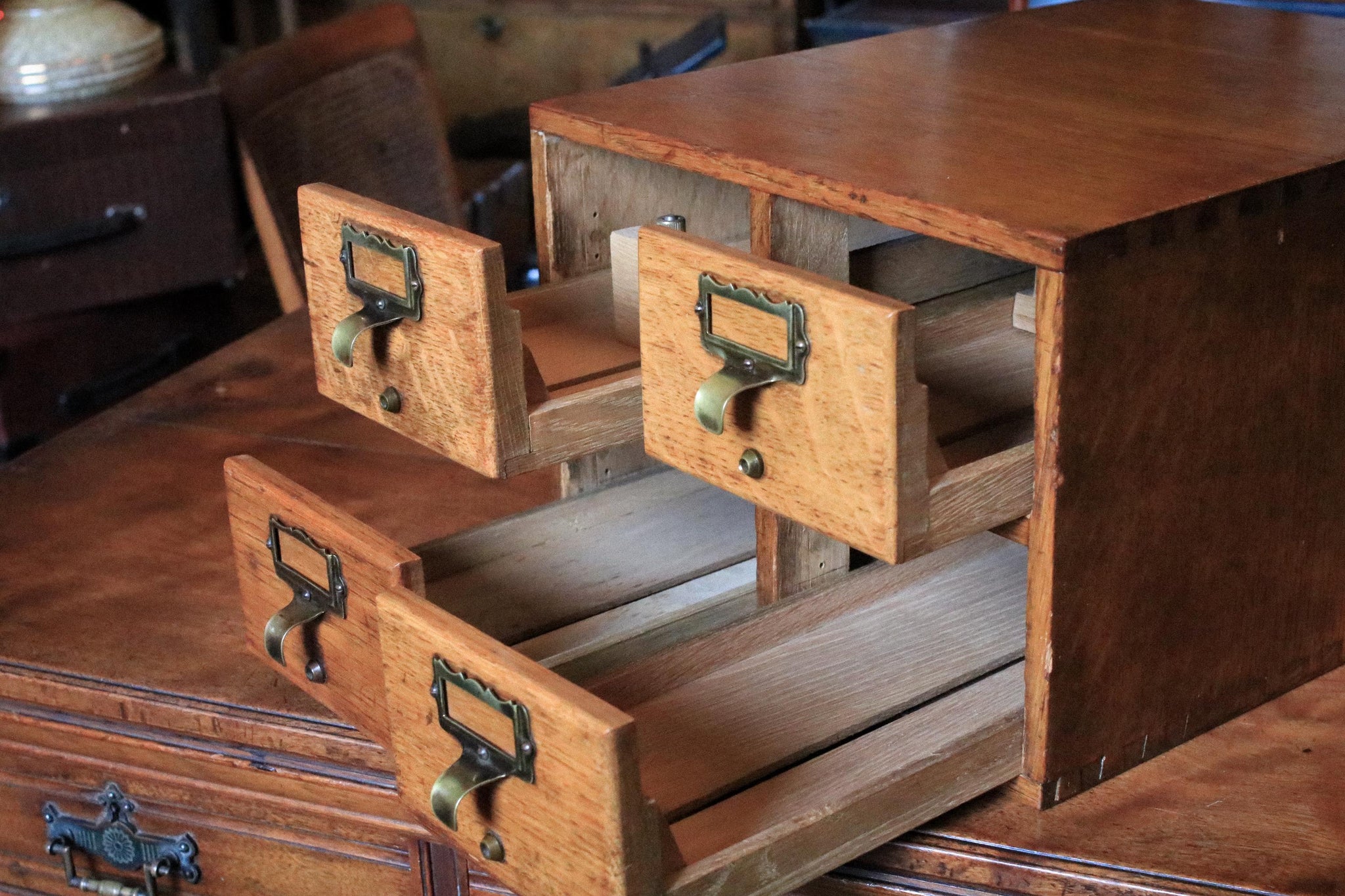 A handsome vintage oak four drawer card index or desktop filing cabinet with warm oak drawer fronts, a darker stained outer case and lovely aged brass label pulls. This is a really useful small-scale storage piece with plenty of character, ideal for ephemera or small collectibles, and it has exactly the sort of practical decorative look that works so well in dark academia, old money and collected study interiors.