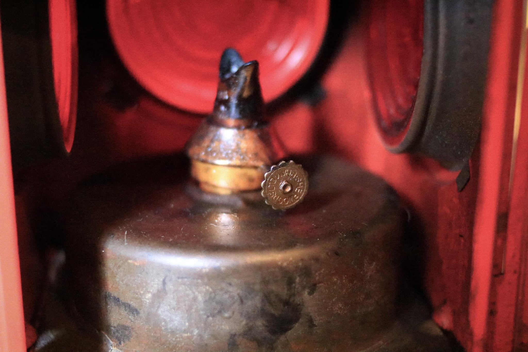 A beautifully grungy old metal signal lantern with its original red paint, twin red glass lenses, and a proper hanging hook handle up top. The hinged side door opens to reveal the oil burner assembly inside, giving it that unmistakable railway/yard-lamp look that works brilliantly as industrial lighting décor, a bar/shop display piece, or film/photography prop styling. It’s bang-on for the current “heritage industrial / railwaycore” trend—authentic wear, honest materials, and that deep red glow vibe.