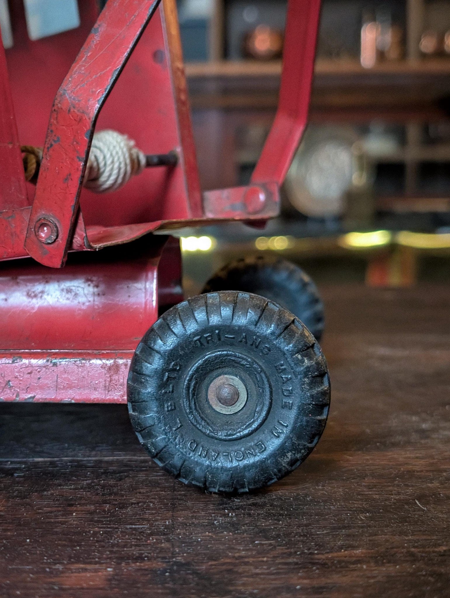 A brilliantly characterful vintage tinplate/pressed-metal toy crane truck in classic fire-engine red, with an articulated boom, pulley wheel, and hand-winch drum with steel cable. It has that perfect “old workshop” patina for styling shelves, a studio, or a kidcore/maximalist cabinet of curiosities, and it looks especially good in an industrial loft setup.