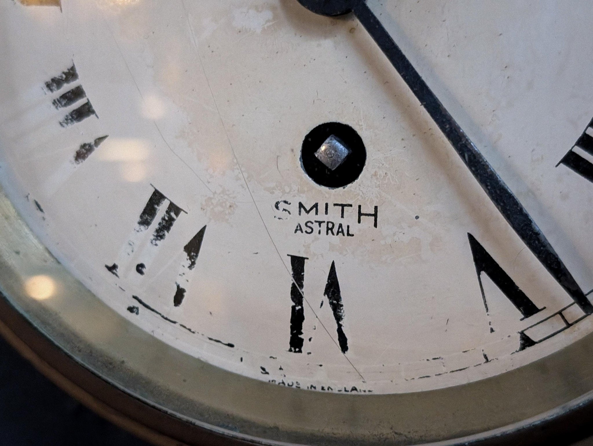 A handsome vintage Smiths Astral brass bulkhead clock with a beautifully worn Roman numeral dial and small seconds sub-dial, full of the warm patina you want for an “Old Money Coastal” study, yacht-club bar, or dark academia shelf styling.