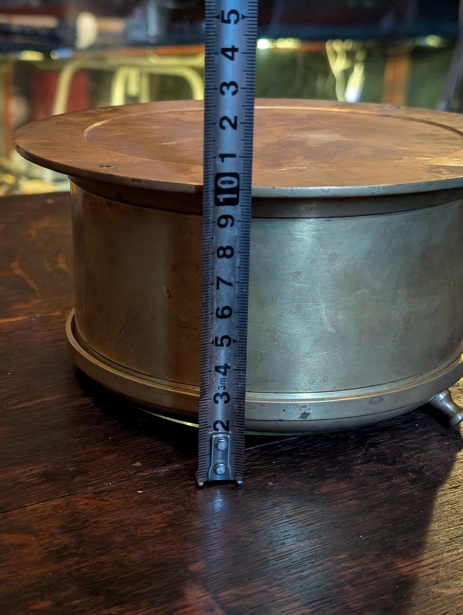 The brass bezel/case shows honest age marks and surface wear, and the dial has visible scuffs/fading consistent with use (please zoom in on photos for condition). The clock is in good working order and is supplied with the winding key.