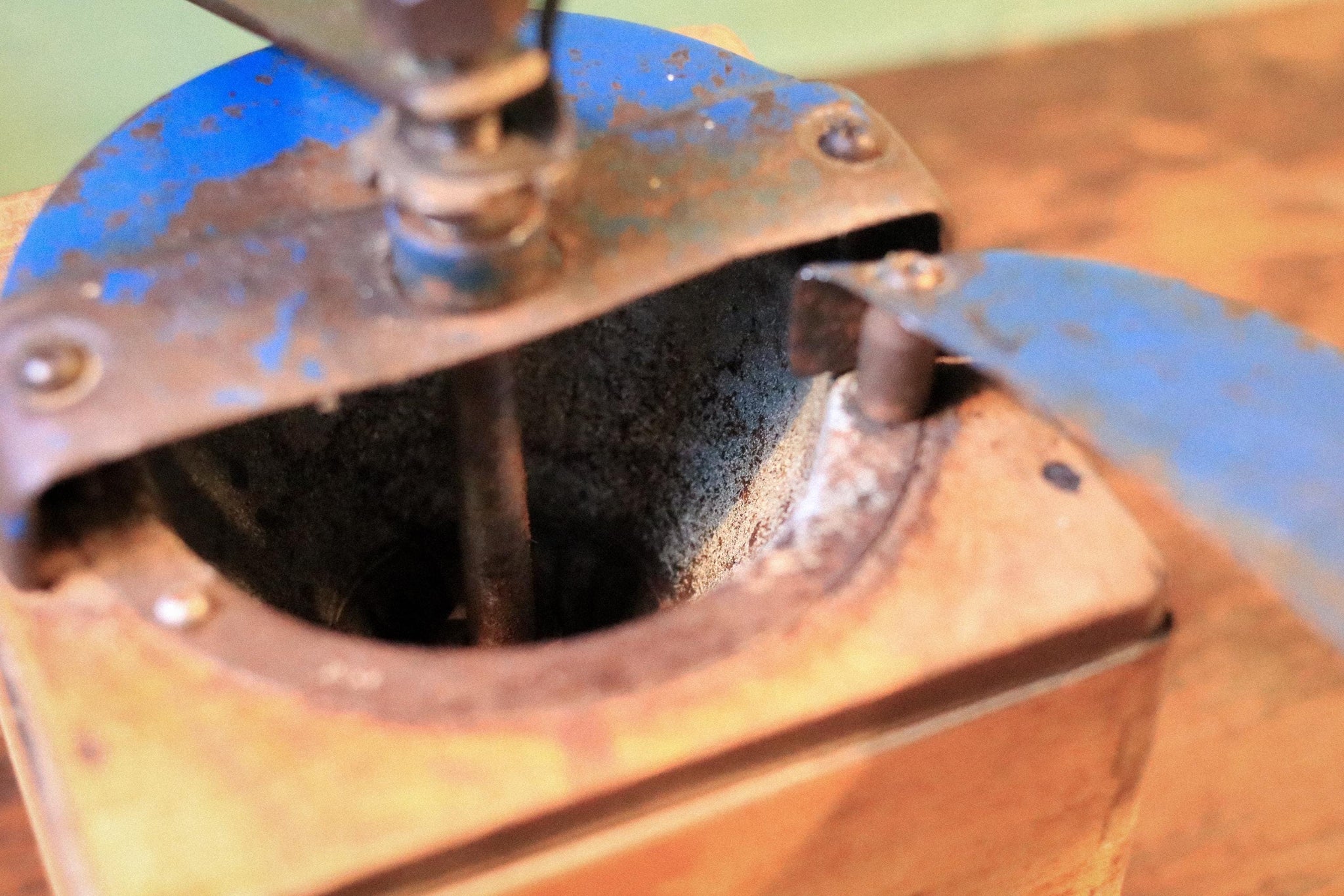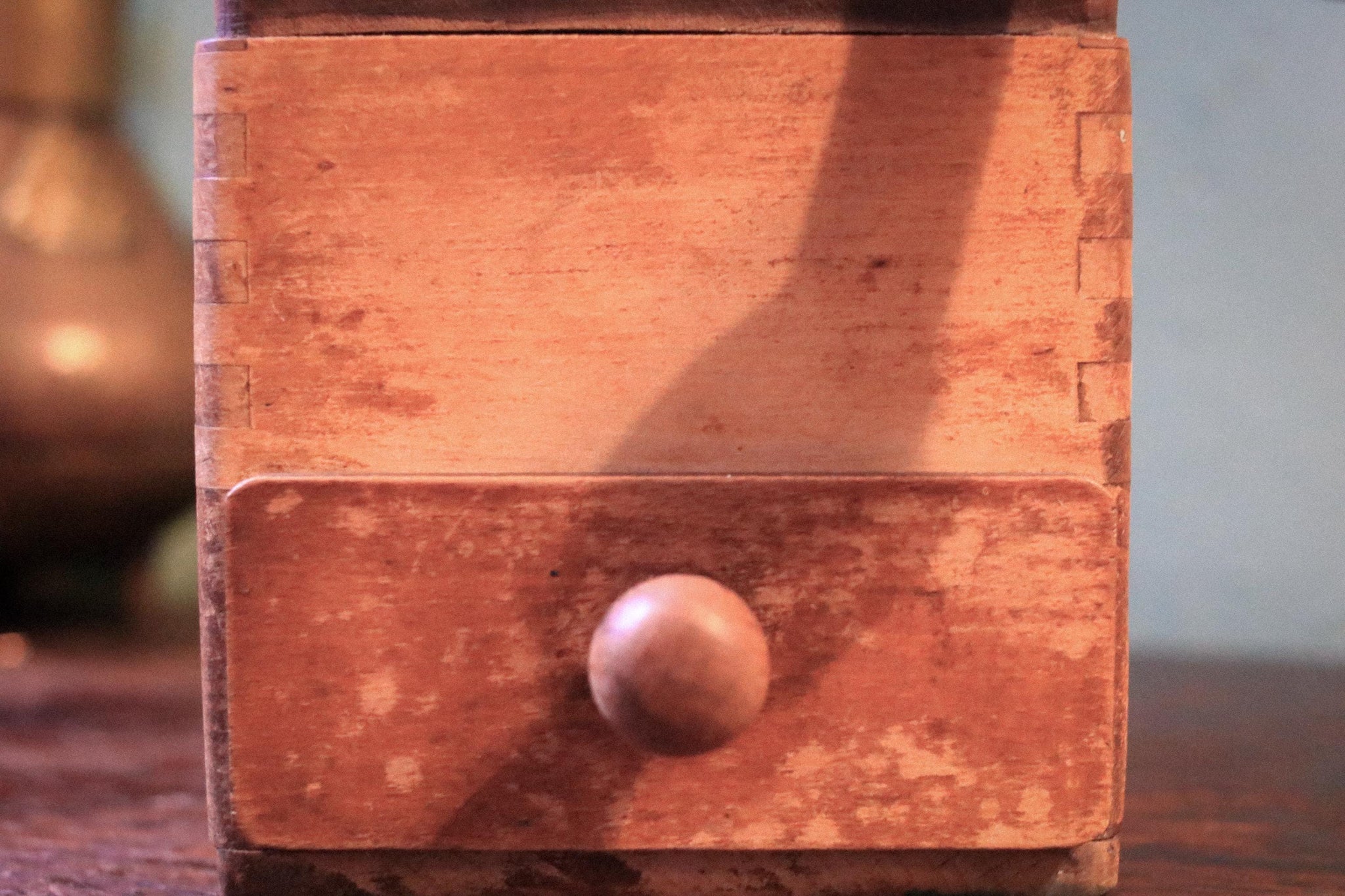 Charming early–mid 20th-century coffee grinder with a pale timber dovetailed box, turned drawer knob and a steel crank capped by a blue enamel lid. The cast burrs turn freely and the hinged fill flap opens smoothly; retains honest wear, enamel losses and age-darkened timber from decades of kitchen use. Seems to work but would require a thorough clean, perfect as decorative country-living texture on a shelf or coffee bar.