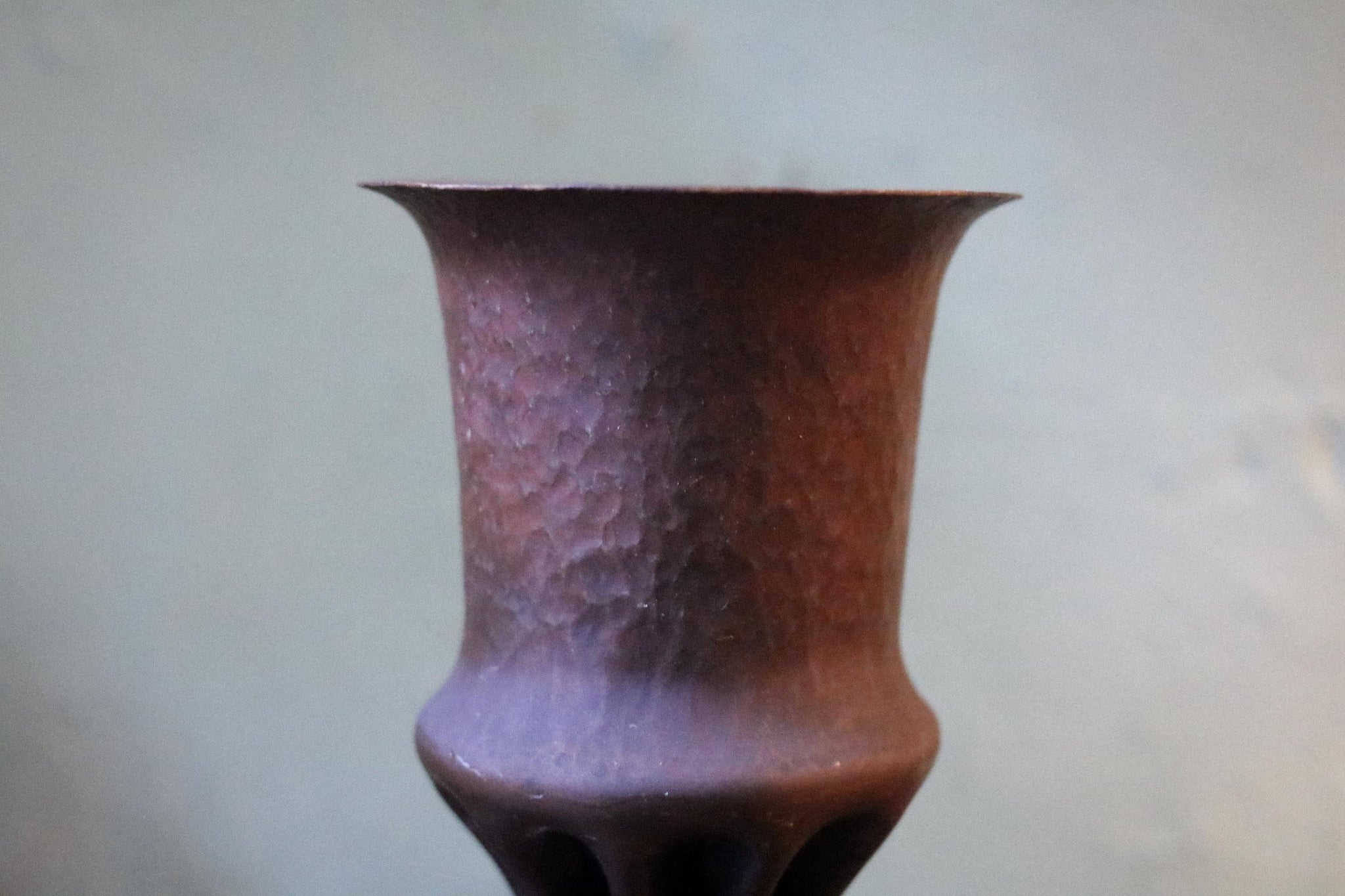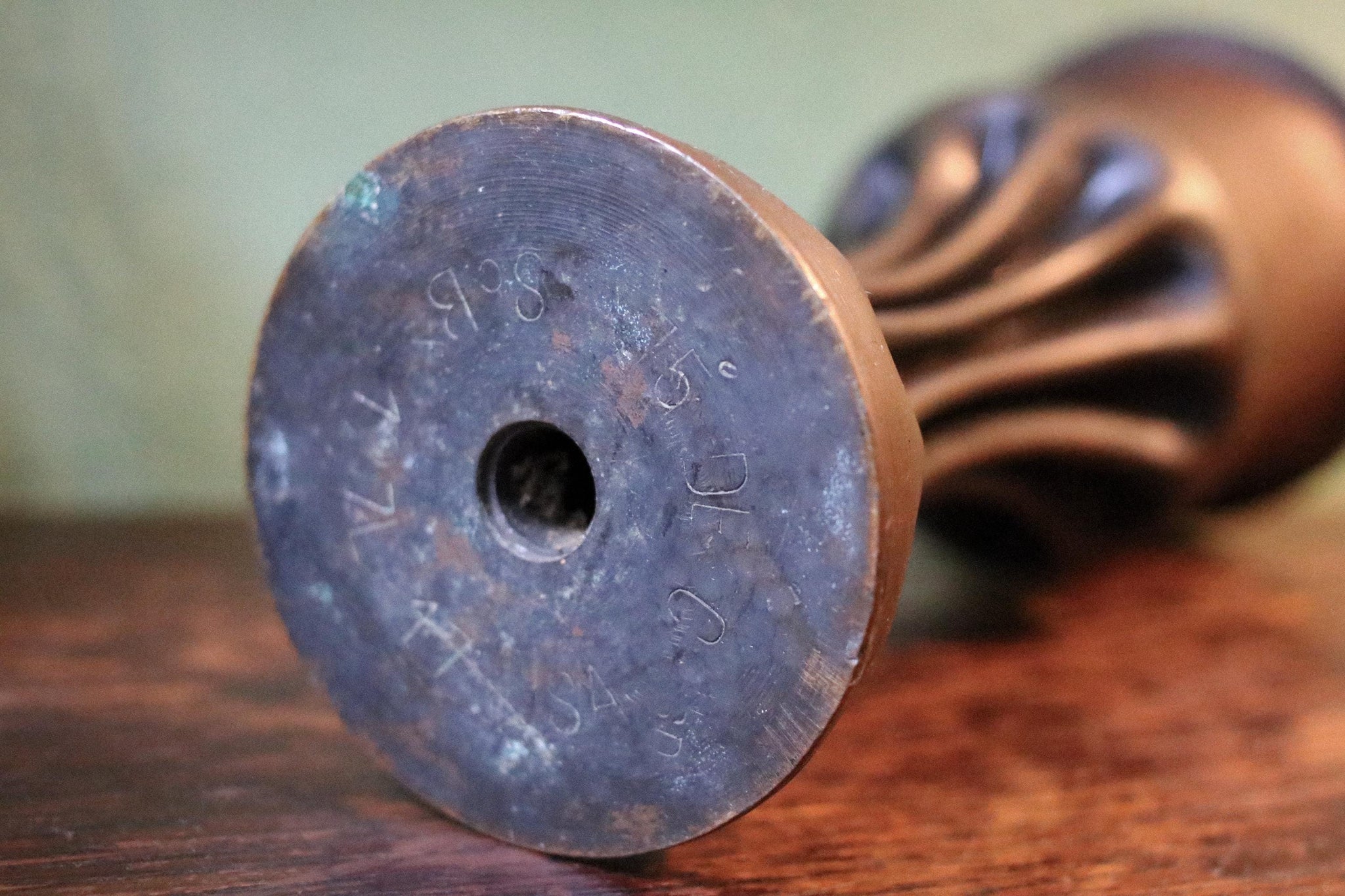 A striking piece of trench art fashioned from a spent artillery shell case, reworked into an elegant flared bud vase with a hammered cup and sculptural, lobed stem flowing to a domed foot. Beautifully hand-formed with deep patina and shadow that reads Arts & Crafts/Art Nouveau. Height 24 cm (approx. 9½").